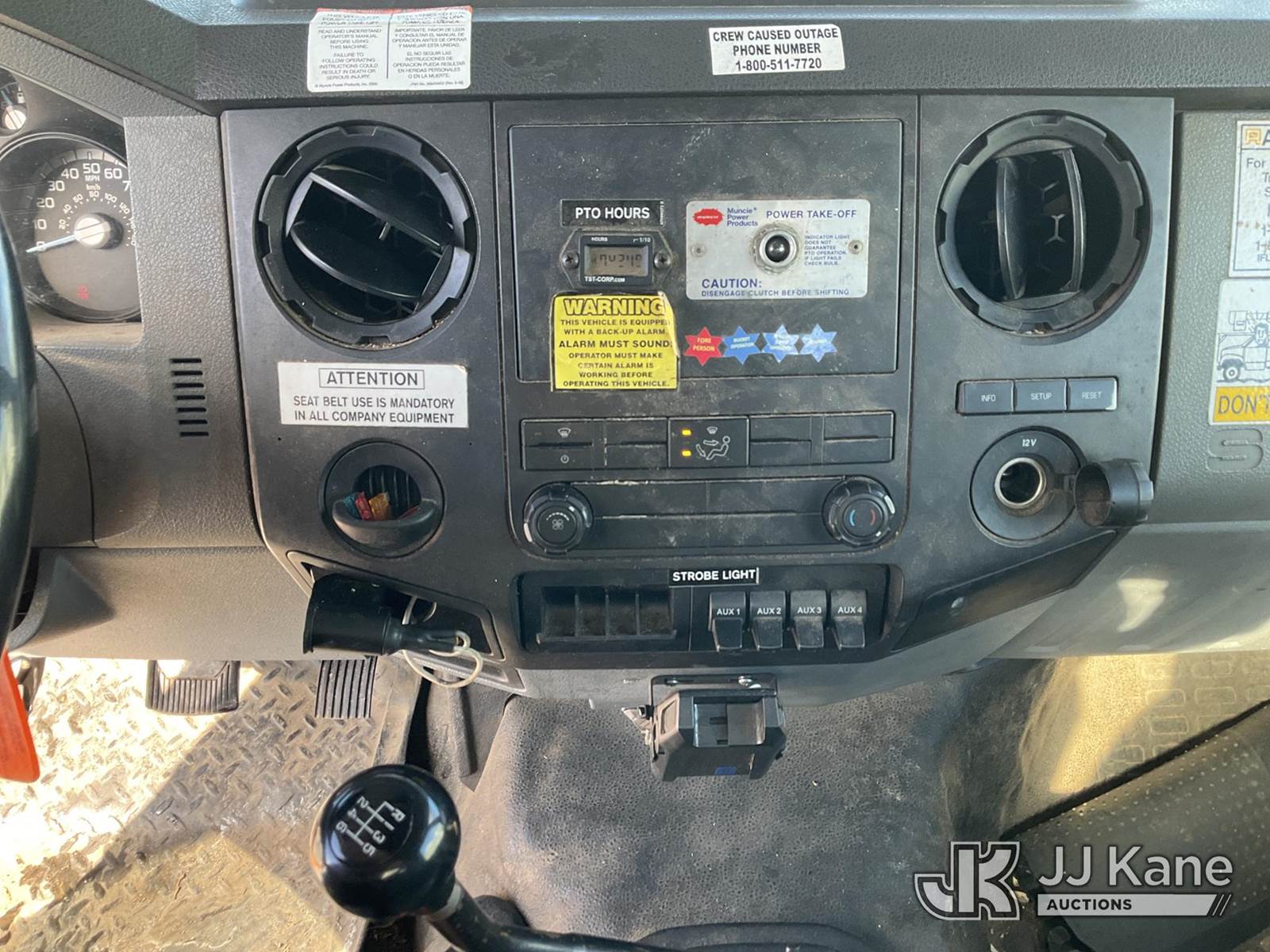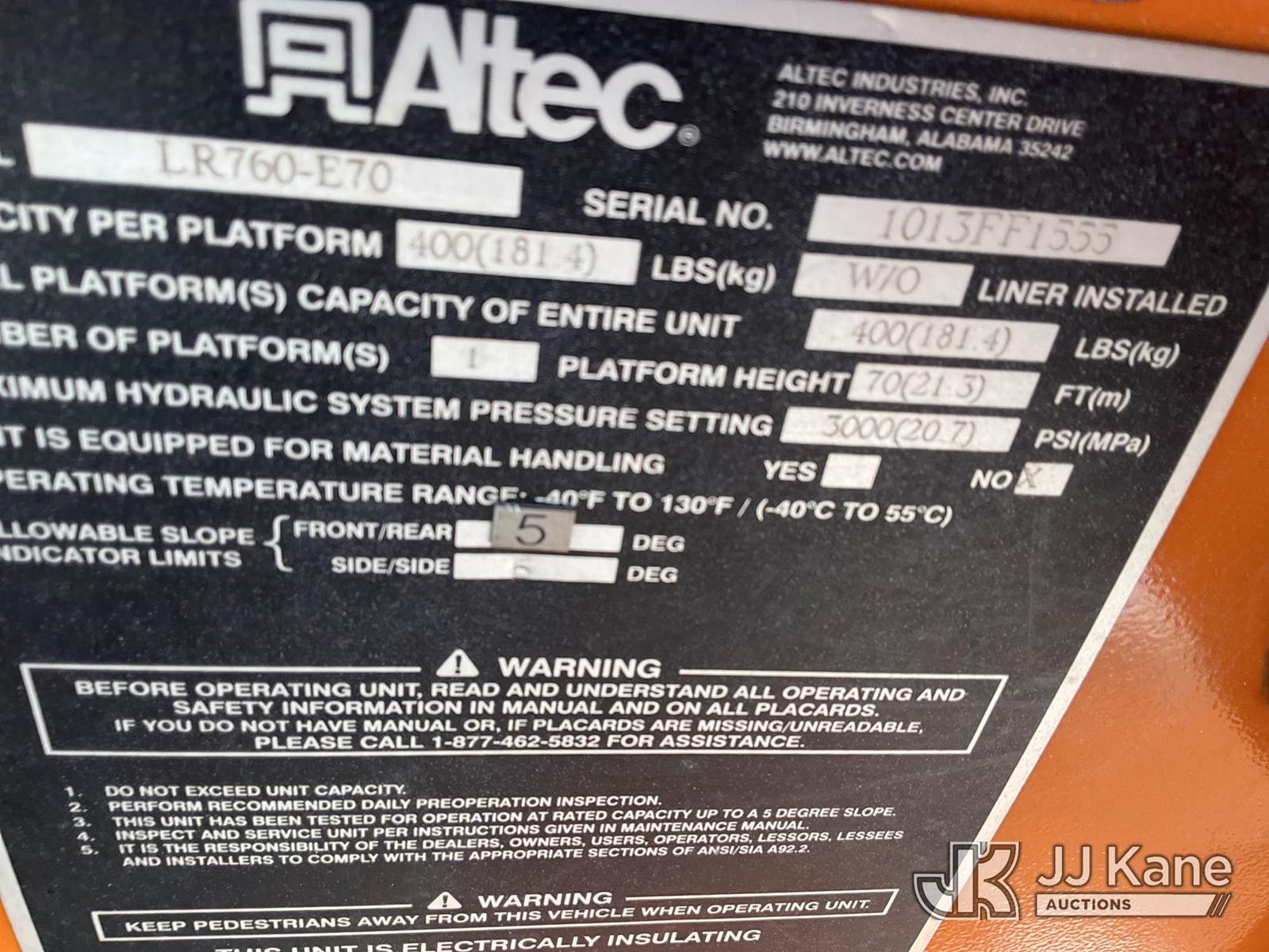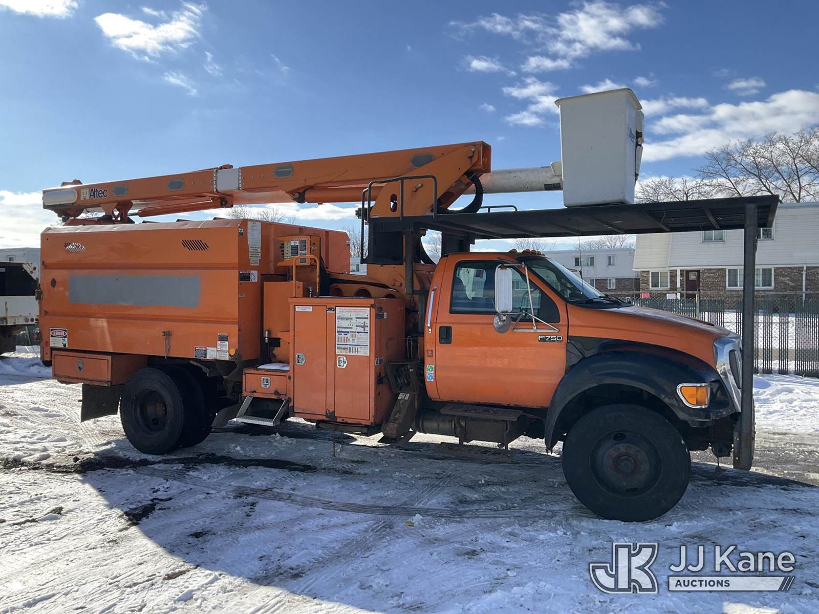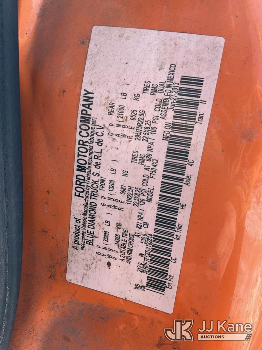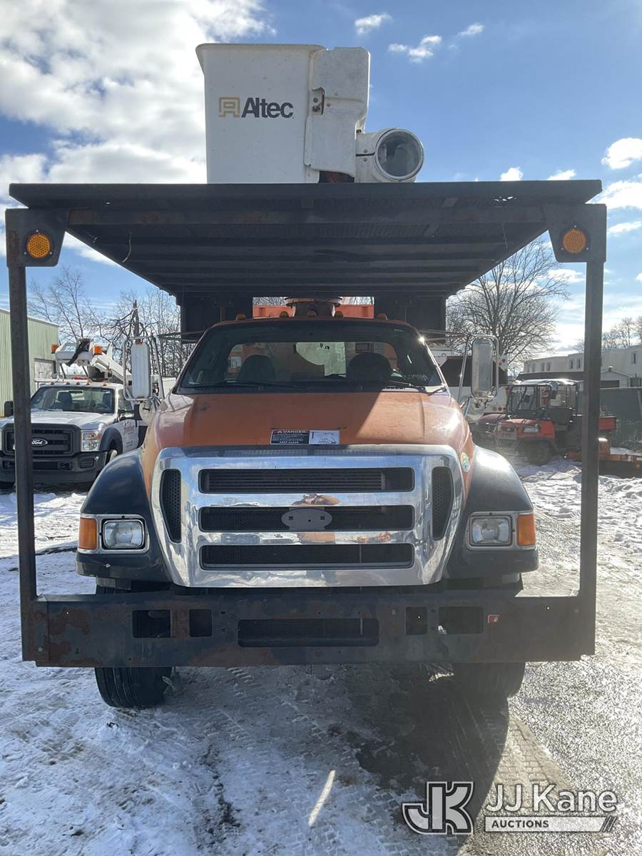 Altec LR760-E70, 75 ft, Over-Center Elevator Bucket Truck s/n 1013FF1555, with single-man bucket & 2 hyd outriggers, mounted on 2013 Ford F-750 Regular Cab 2WD DRW Chipper Dump Truck, 6.7L L6 DIESEL 4X2, 6-spd manual, (84,144 miles) (Runs, Moves, Unable to Engage PTO-Upper Condition Unknown)(Seller States-Turbo and actuator need replaced.) This is a Titled Item NOTE: This unit is being sold AS IS/WHERE IS via Timed Auction and is located in Neenah, WI. Inspection & preview days for this unit are by appointment only; please contact us at contact@jjkane.com or 84-Go-JJKane for more details. (Manuals provided in cab) (Buyer is responsible for removal. Assistance by consignor or JJ Kane Auctions is not assured.)