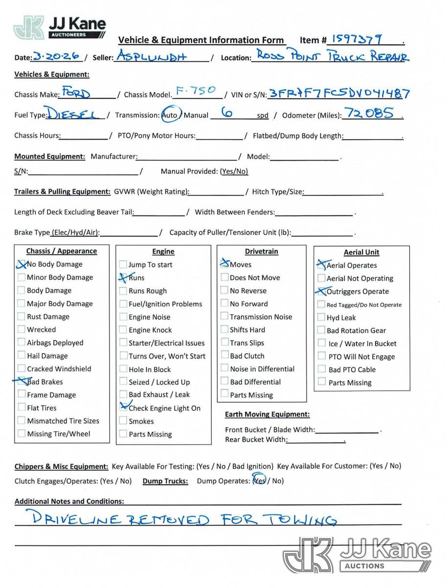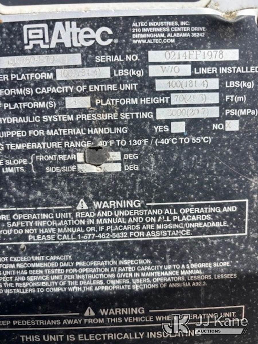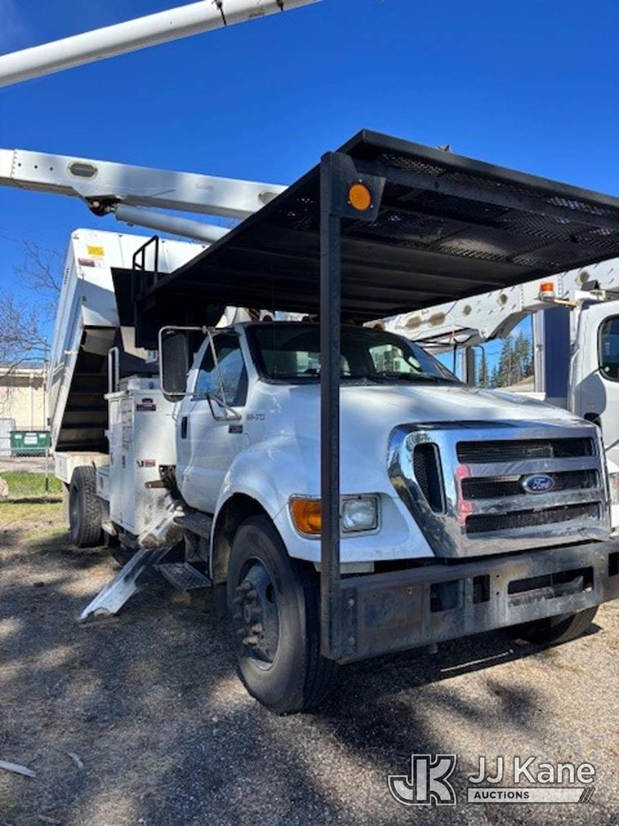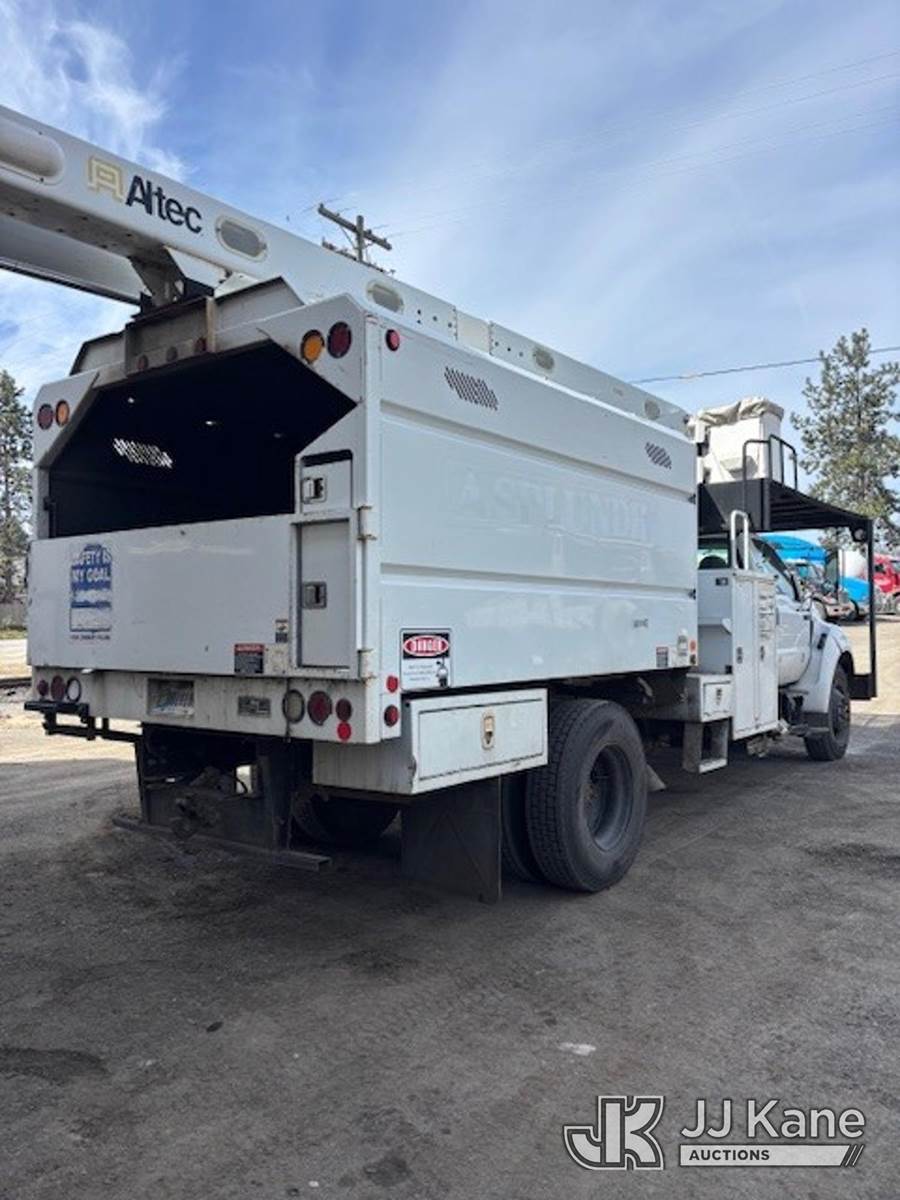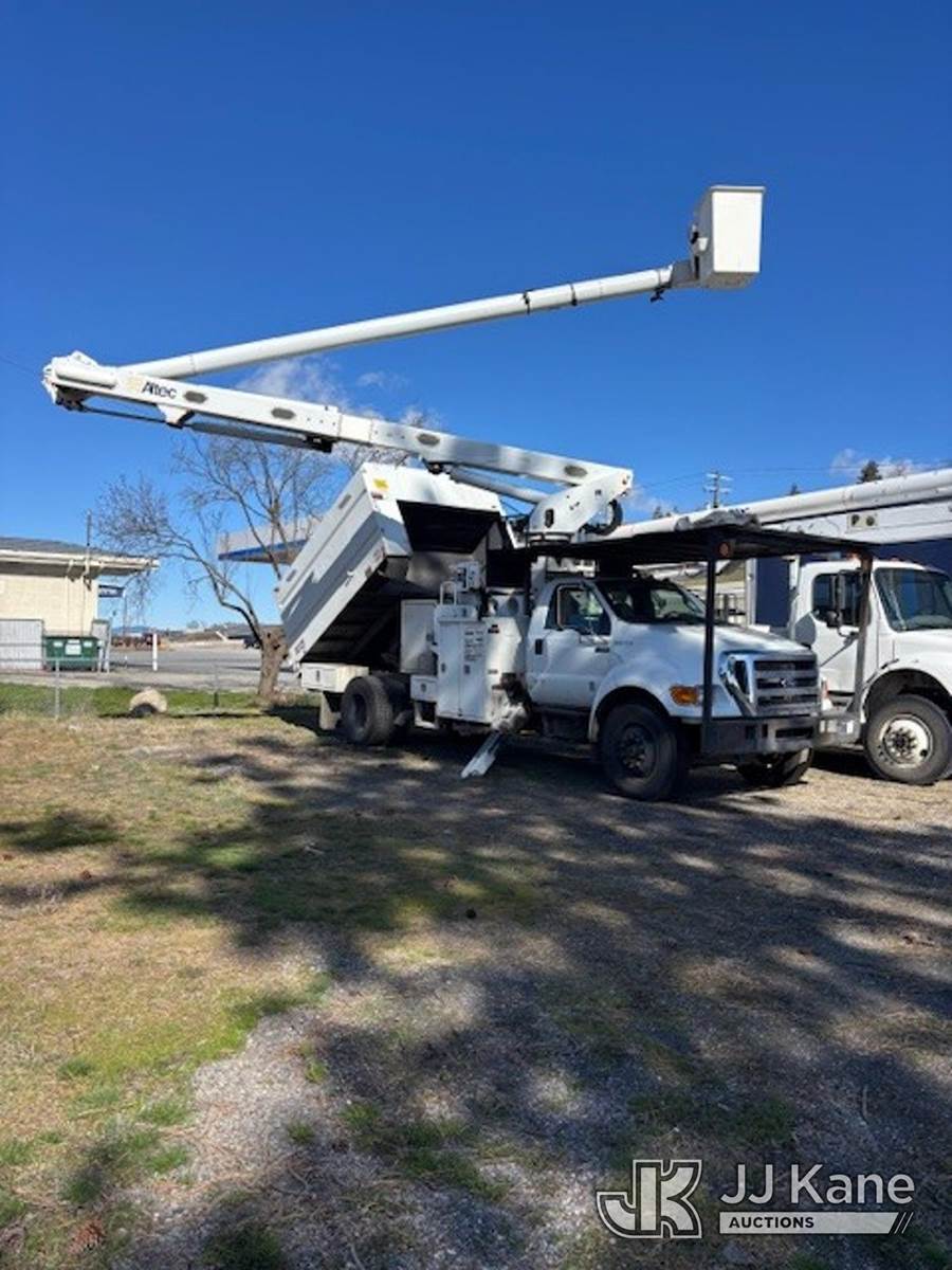 Altec LR760E70, 75 ft, Over-Center Elevator Bucket Truck s/n 0214FF1978, with single man bucket, mounted behind cab on 2013 Ford F-750 Chipper Dump Truck, 6.7L diesel, 4X2, 6-spd, (72,085 miles) (Runs, Upper Operates) (Does Not Move - Driveline Removed For Transport, Bad Brakes, Check Engine Lights On) (Seller States: Needs new brake system) This is a Titled Item NOTE: This unit is being sold AS IS/WHERE IS via Timed Auction and is located in Post Falls, ID. For more information & removal arrangements please contact Jeremy Walters @ jeremy.walters@jjkane.com. (Missing manuals, See Auction Company for Manufacturers Information to obtain manuals) (Buyer is responsible for removal. Assistance by consignor or JJ Kane Auctions is not assured.)