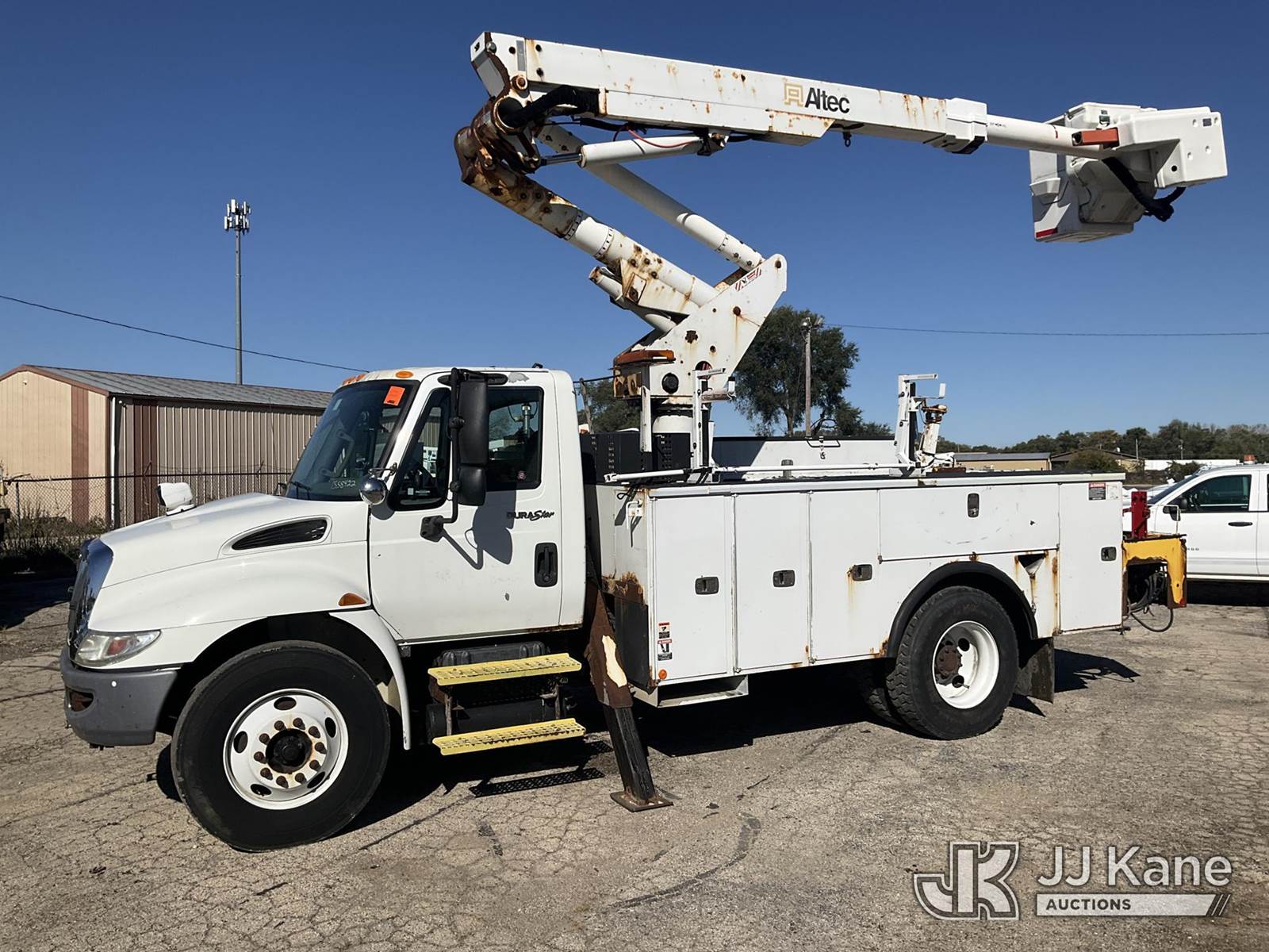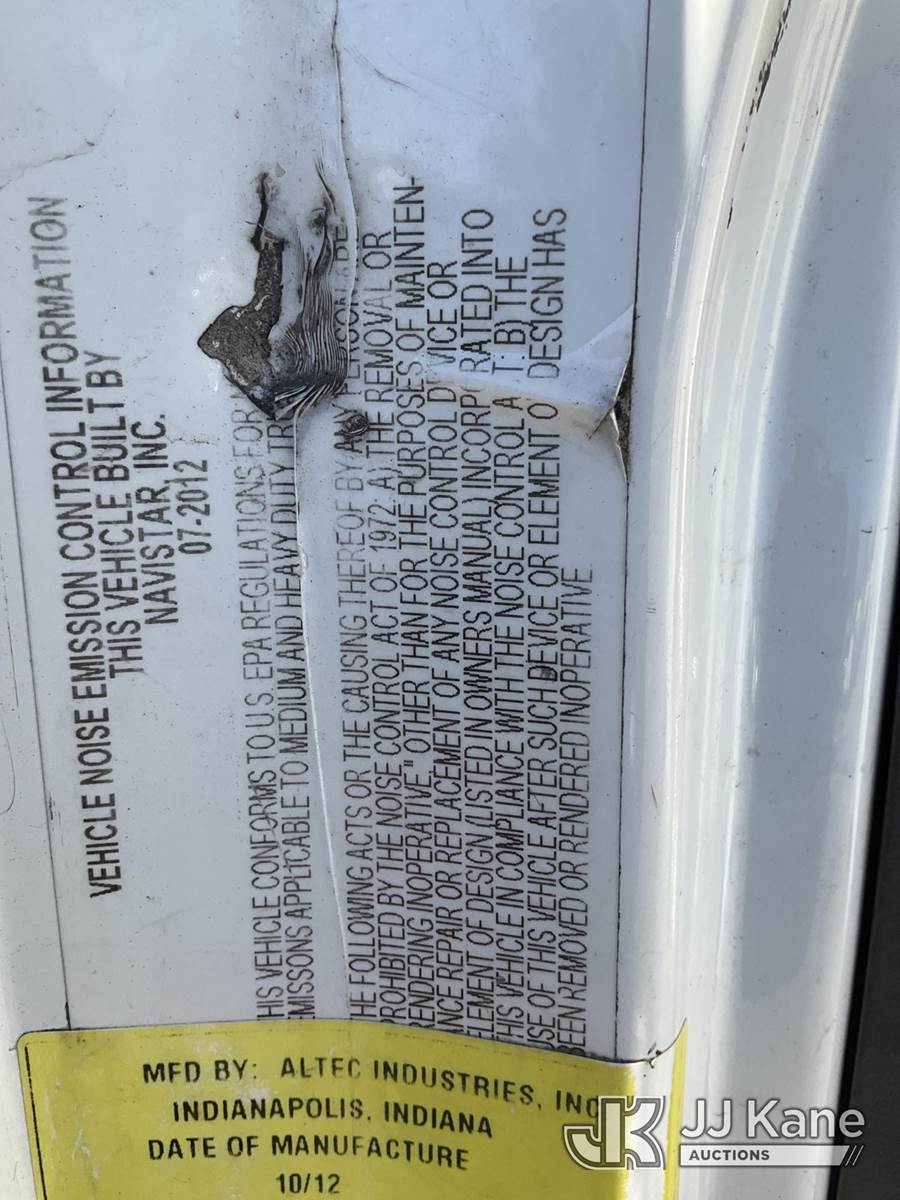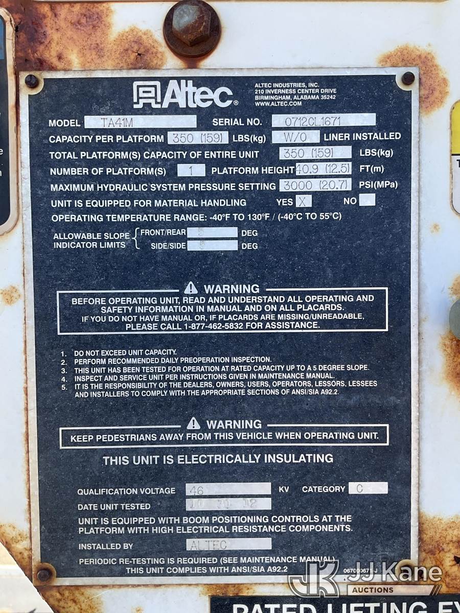 Altec TA41M, 45 ft, Articulating & Telescopic Bucket Truck s/n 0712CL1671, with single-man bucket, mounted behind cab on 2013 International 4300 Utility Truck, 7.6L Auto, 4X2, diesel, A/C, with Travel Height 12ft 4in, (173,259 miles) (Runs, Moves & Upper Operates) (Paint Damage, Rear Tail Shelf Rusty) (Reads 13,120 hours) This is a Titled Item NOTE: This unit is being sold AS IS/WHERE IS via Timed Auction and is located in South Beloit, IL. Inspection & preview days for this unit are the 2 business days prior to the first day of items closing for this auction, item is located at 14354 Dearborn Ave South Beloit, IL and hours of operations are 8a-4p. For pre-sale questions, please contact Derek Eklund at (608) 904-0618 or (derek.eklund@jjkane.com). (Manuals provided in cab) (Buyer is responsible for removal. Assistance by consignor or JJ Kane Auctioneers is not assured.)