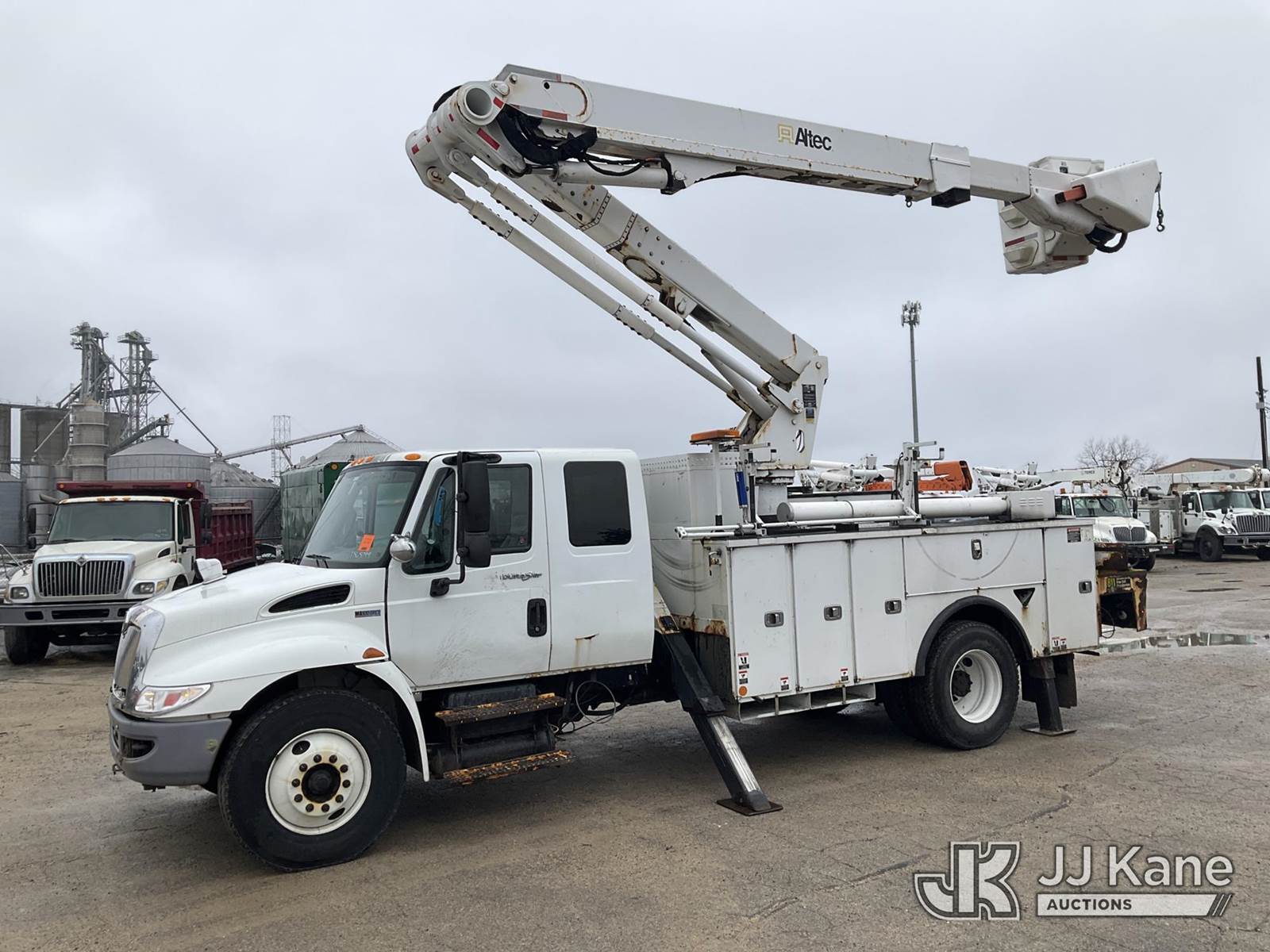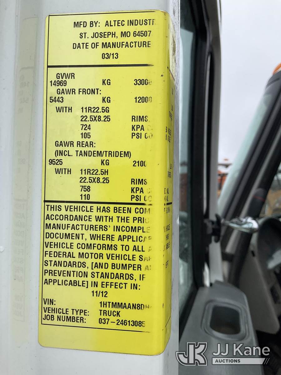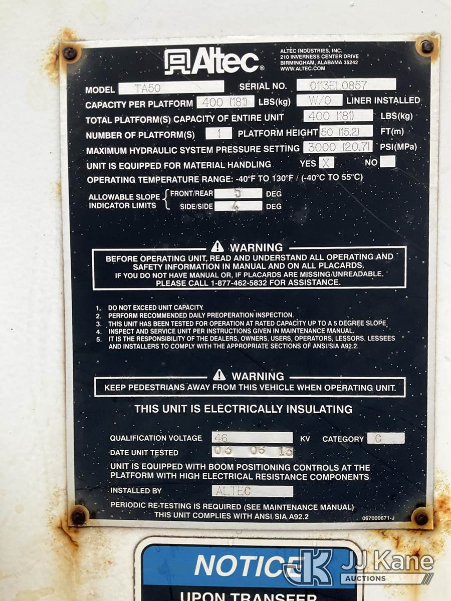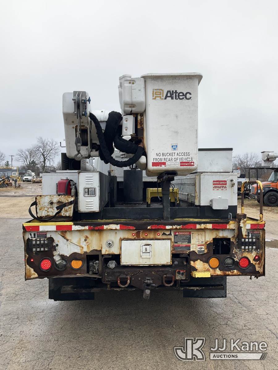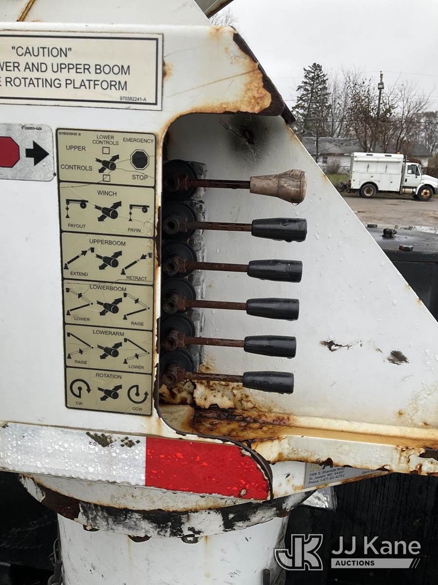 Altec TA50, 55 ft, Articulating & Telescopic Material Handling Bucket Truck s/n 0113EL0857, with single man bucket, rear mounted on 2013 International 4300 Extended-Cab Utility Truck, 7.6L diesel Auto, 4X2, A/C, (128,463 miles) (Runs, Moves, & Upper Operates)(Body/Rust/Paint Damage) (Reads 20,253 hours) This is a Titled Item NOTE: This unit is being sold AS IS/WHERE IS via Timed Auction and is located in South Beloit, IL. Inspection & preview days for this unit are the 2 business days prior to the first day of items closing for this auction, item is located at 14354 Dearborn Ave South Beloit, IL and hours of operations are 8a-4p. For pre-sale questions, please contact Derek Eklund at (608) 904-0618 or (derek.eklund@jjkane.com). (Manuals provided in cab) (Buyer is responsible for removal. Assistance by consignor or JJ Kane Auctioneers is not assured.)