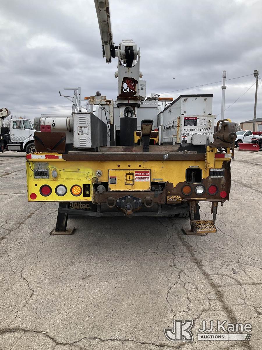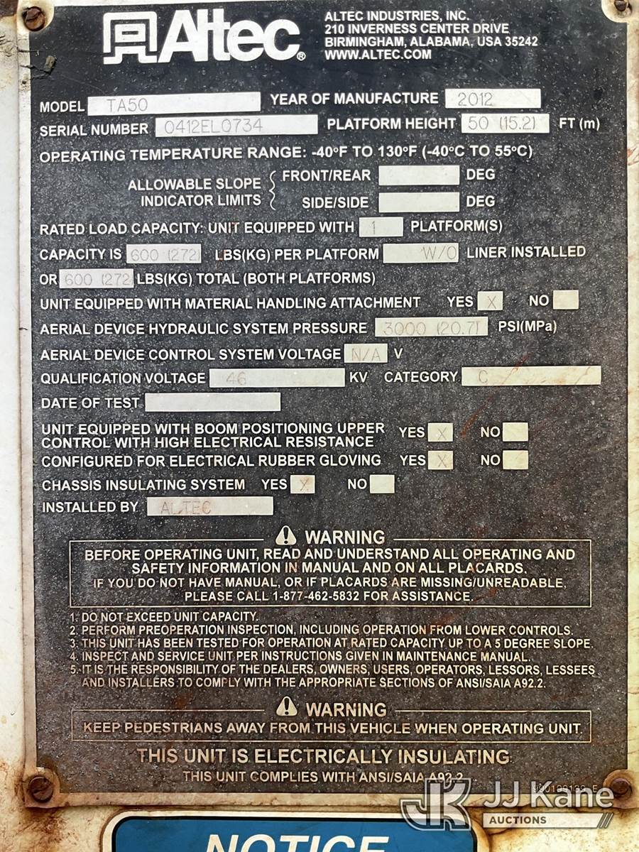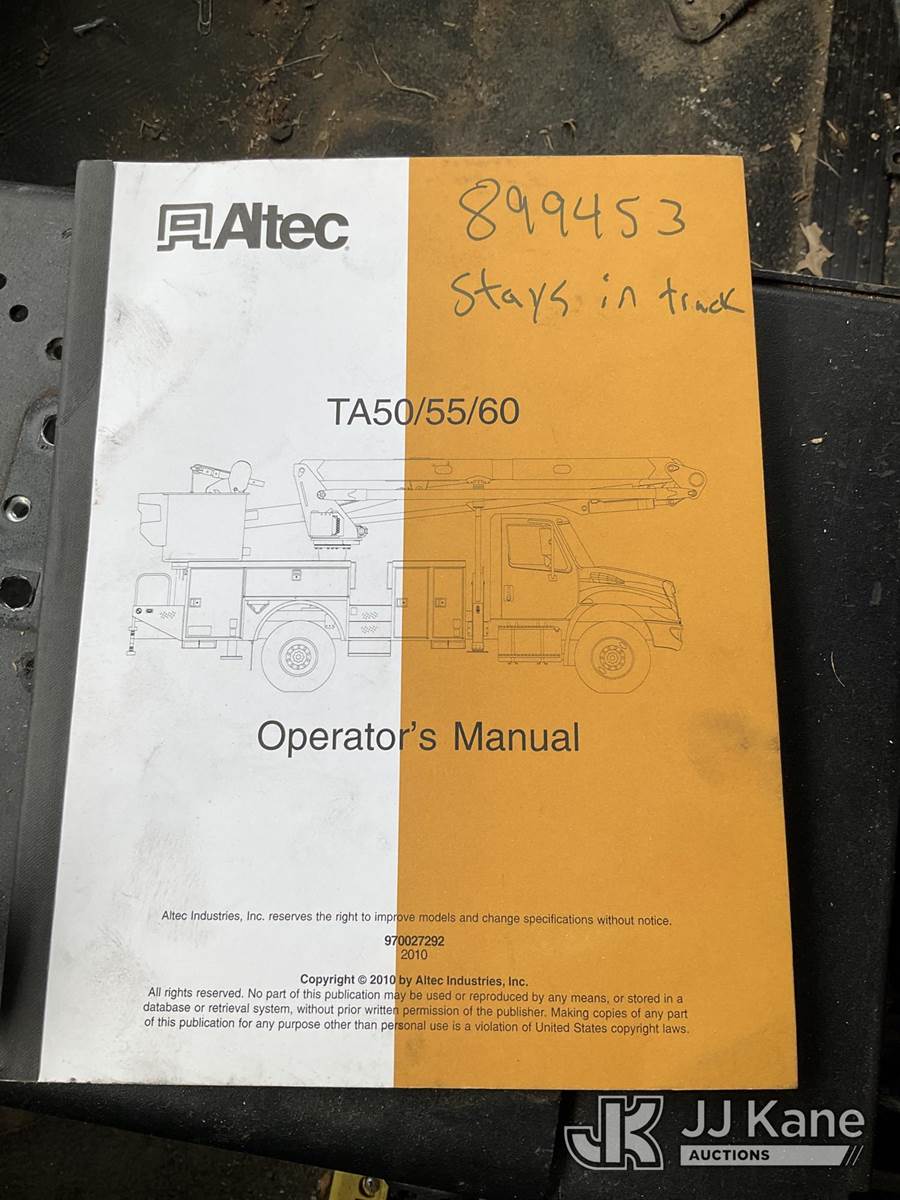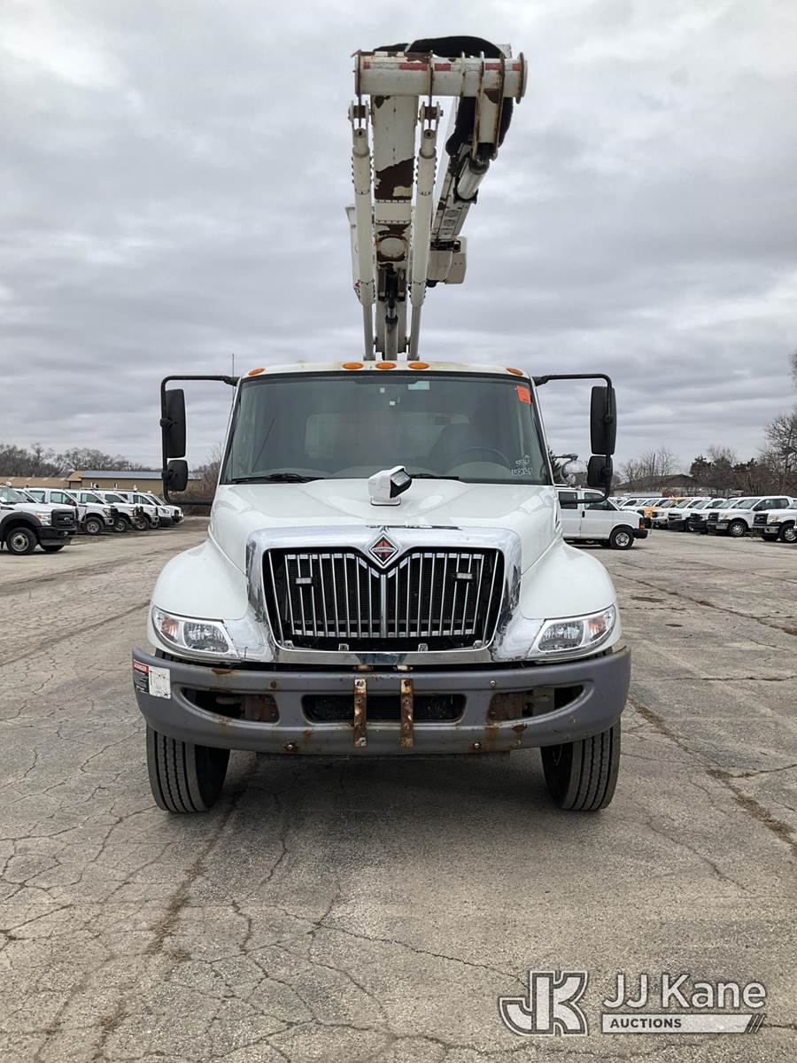 Altec TA50, 55 ft, Articulating & Telescopic Material Handling Bucket Truck s/n 0412EL0734, with Two-Man Bucket, mounted behind cab on 2013 International 4300 Utility Truck, 7.6L L6 DIESEL 4X2, Auto, A/C, (152,134 miles) (Runs, Moves & Upper Operates) (Check Engine Light On, Parked Regen Light On, Passenger Seat Removed, Unable To Open Two Passenger Side Utility Doors, Rust Damage) (Reads 16,126 hours) This is a Titled Item NOTE: This unit is being sold AS IS/WHERE IS via Timed Auction and is located in South Beloit, IL. Inspection & preview days for this unit are the 2 business days prior to the first day of items closing for this auction, item is located at 14354 Dearborn Ave South Beloit, IL and hours of operations are 8a-4p. For pre-sale questions, please contact Derek Eklund at (608) 904-0618 or (derek.eklund@jjkane.com). (Manuals provided in cab) (Buyer is responsible for removal. Assistance by consignor or JJ Kane Auctions is not assured.)