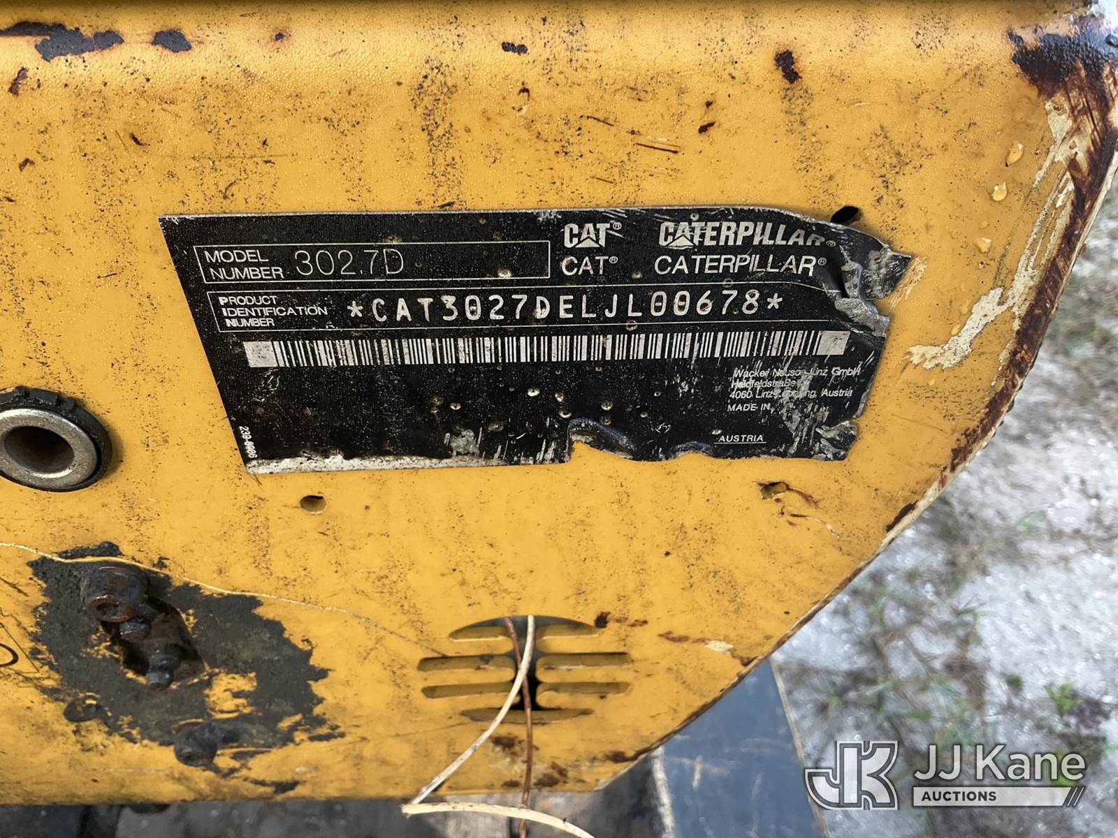 2013 Caterpillar 302.7D Mini Hydraulic Excavator, s/n CAT3027DELJL00678, Hydraulic Drive, diesel, with aux hydraulics, backfill blade, rubber tracks, ROPS, (Not Running, Condition Unknown, Left Track Missing, Right Track Damaged, No Key, Body Damage) NOTE: This unit is being sold AS IS/WHERE IS via Timed Auction and is located in Thonotosassa, FL. Inspection & preview days for this unit are the 2 business days prior to the first day of items closing for this auction, item is located at 11720 N US 301 Thonotosassa, Fl 33592 and hours of operations are 8a-4p. For pre-sale questions, please contact Office Staff @ (813) 986-2485. (Buyer is responsible for removal. Assistance by consignor or JJ Kane Auctions is not assured.)