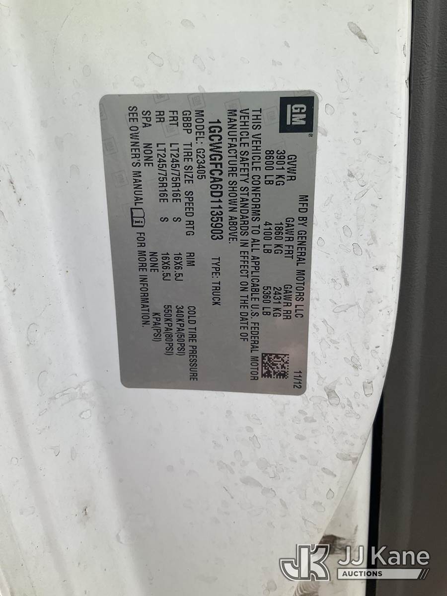2013 Chevrolet Express 2500 Cargo Cargo Van, 4.8L V8 OHV 16V 6-Speed Automatic, RWD, Gas, A/C, (77,973 miles) (Runs & Moves) (Airbag Light On, Side Door Handle Broken, Tar On Paint-Rear Wheels) (Reads 3,893 hours) This is a Titled Item NOTE: This unit is being sold AS IS/WHERE IS via Timed Auction and is located in South Beloit, IL. Inspection & preview days for this unit are the 2 business days prior to the first day of items closing for this auction, item is located at 14354 Dearborn Ave South Beloit, IL and hours of operations are 8a-4p. For pre-sale questions, please contact Derek Eklund at (608) 904-0618 or (derek.eklund@jjkane.com). (Buyer is responsible for removal. Assistance by consignor or JJ Kane Auctioneers is not assured.)