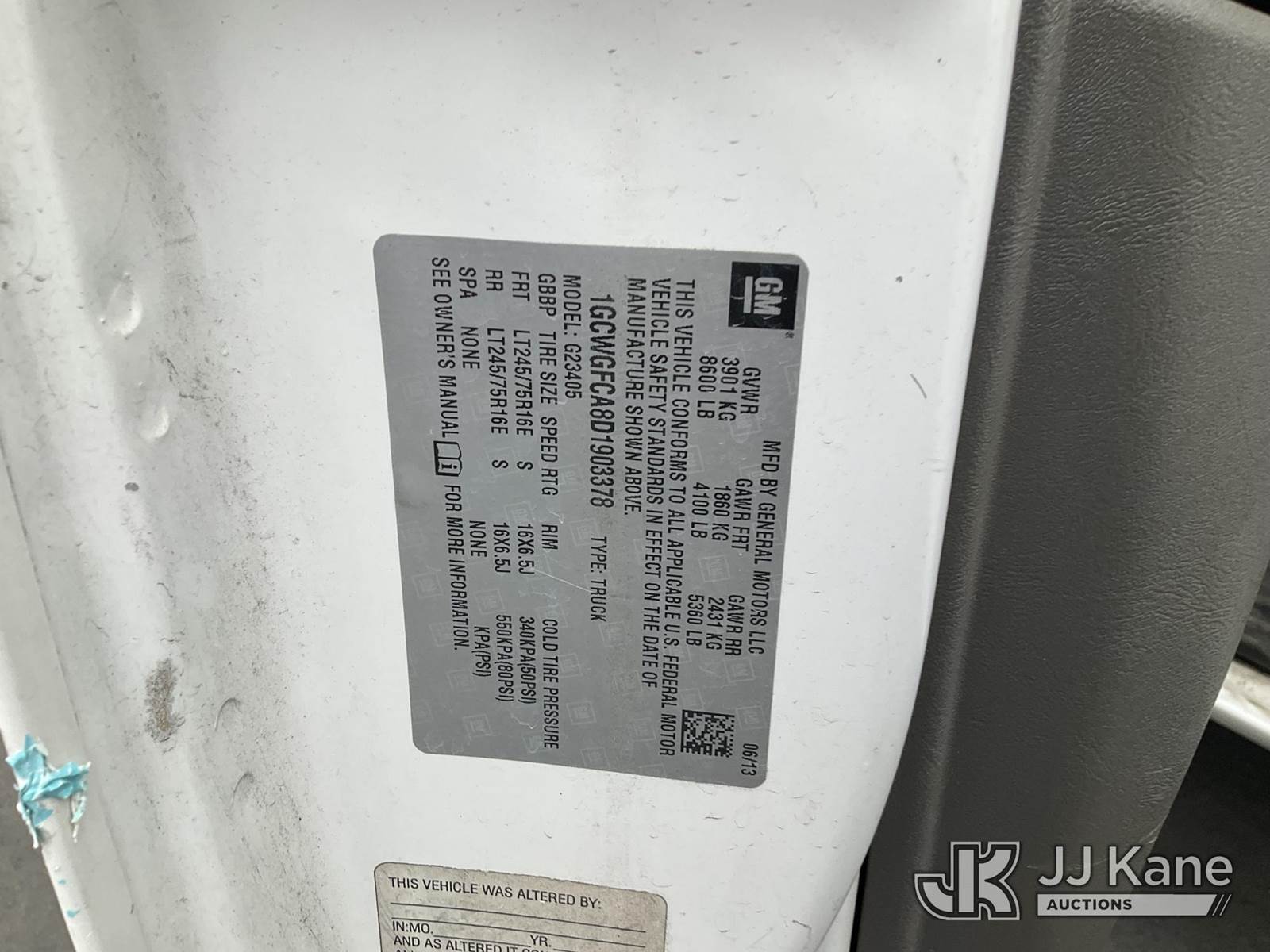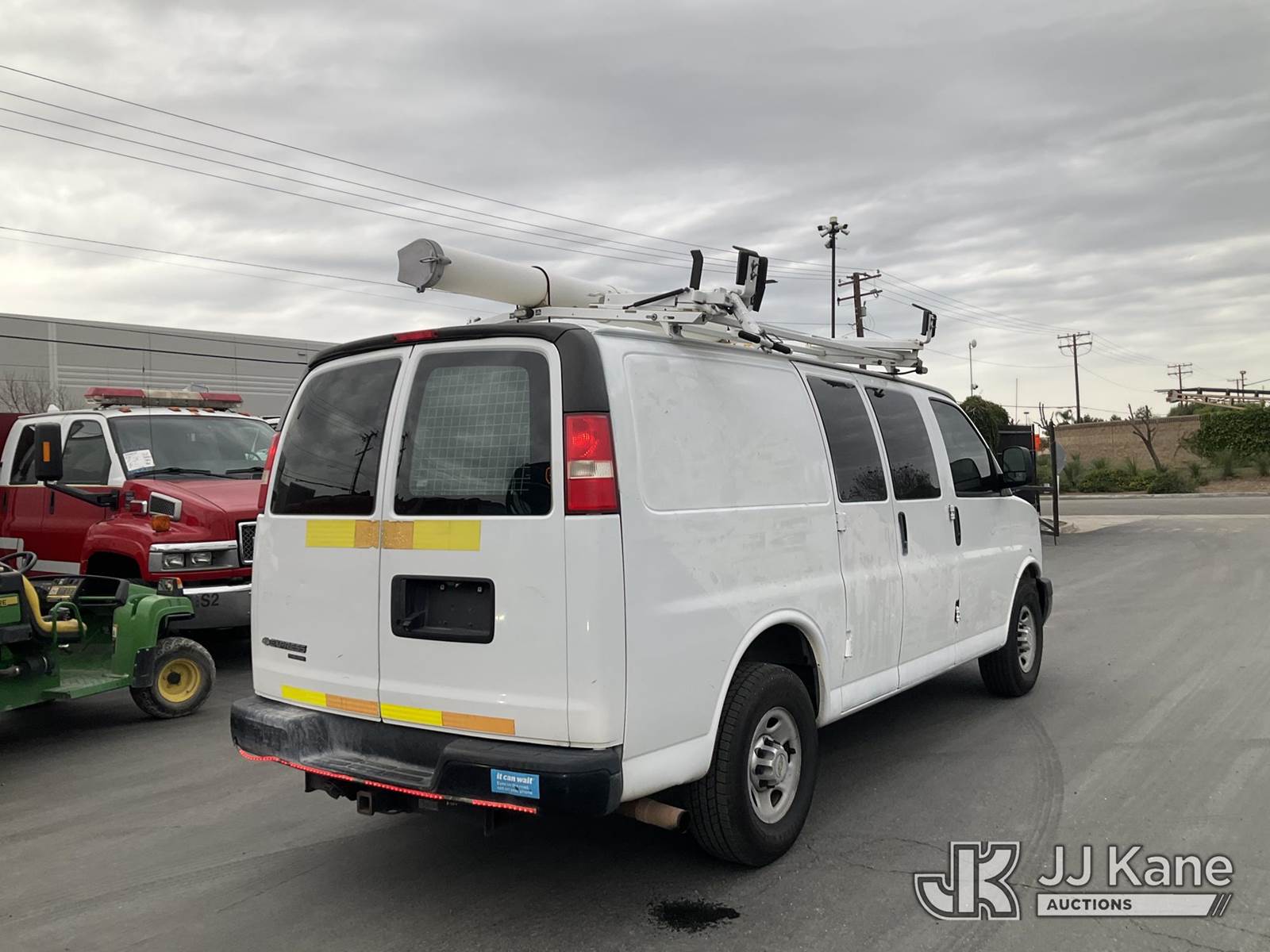 2013 Chevrolet Express 2500 Cargo Van, s/n 1GCWGFCA8D1903378, 4.8L V8 OHV 16V Gas, 6-Speed Automatic, RWD, A/C, with Tow Package, Metal Shelves, Ladder Rack , (128,403 miles) (Runs & Moves ) This is a Titled Item NOTE: This unit is being sold AS IS/WHERE IS via Timed Auction and is located in Jurupa Valley, CA. Inspection & preview days for this unit are the 2 business days prior to the first day of items closing for this auction, item is located at 4510 Muth Way Jurupa Valley, CA 92509 and hours of operations are 8a-4p. For pre-sale questions, please contact please contact Office Staff @ (310) 353-7140. Dealer License Number 45696. (Buyer is responsible for removal. Assistance by consignor or JJ Kane Auctions is not assured.)