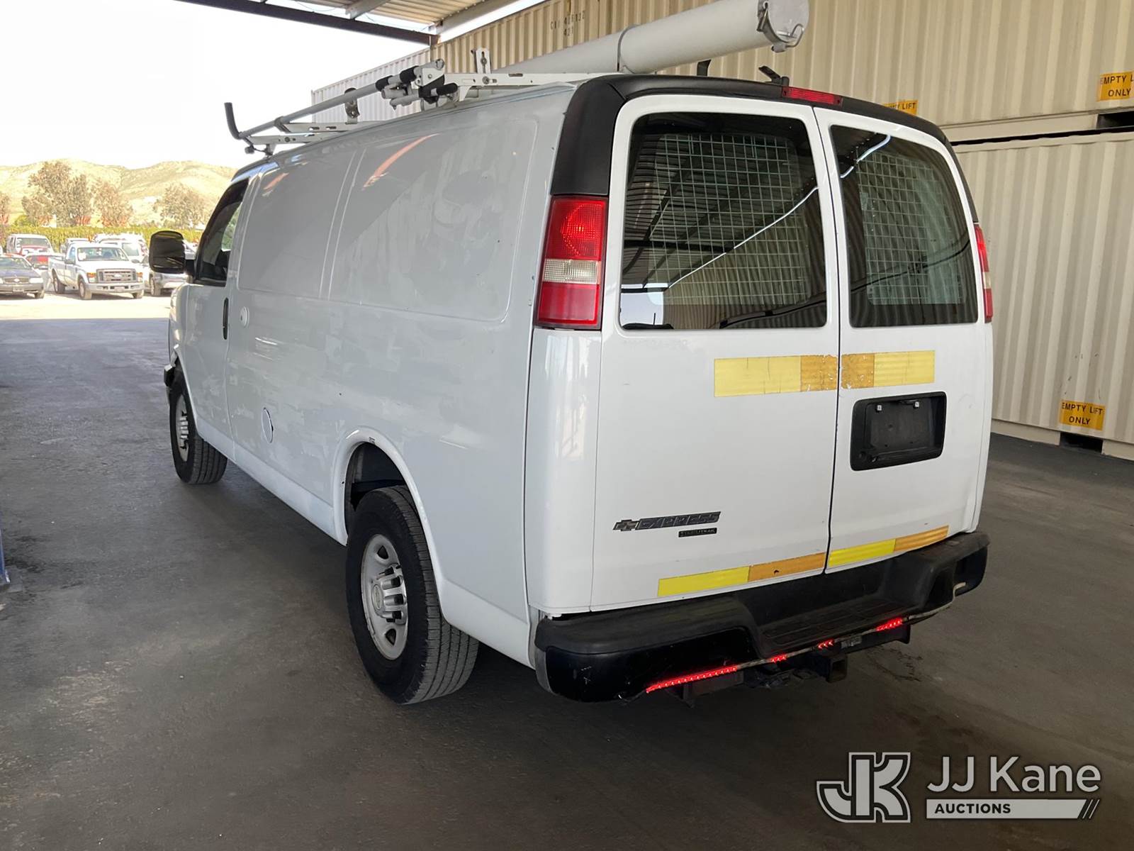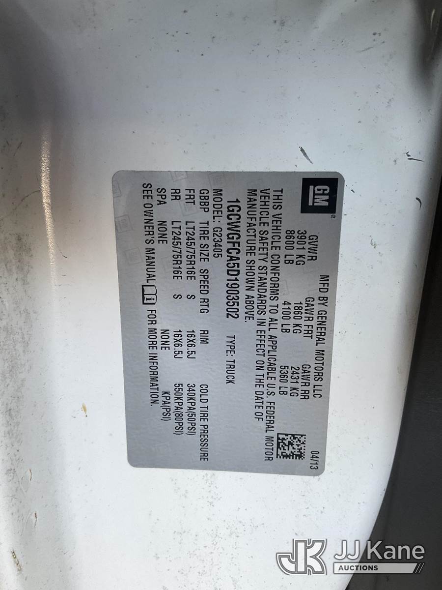 2013 Chevrolet Express 2500 Cargo Van, s/n 1GCWGFCA5D1903502, 8-cyl gas, 6-Speed Automatic, A/C, with Ladder rack, tow package, (78,390 miles) (Runs & Moves) This is a Titled Item NOTE: This unit is being sold AS IS/WHERE IS via Timed Auction and is located in Jurupa Valley, CA. Inspection & preview days for this unit are the 2 business days prior to the first day of items closing for this auction, item is located at 4510 Muth Way Jurupa Valley, CA 92509 and hours of operations are 8a-4p. For pre-sale questions, please contact please contact Office Staff @ (310) 353-7140. Dealer License Number 45696. (Buyer is responsible for removal. Assistance by consignor or JJ Kane Auctions is not assured.)
