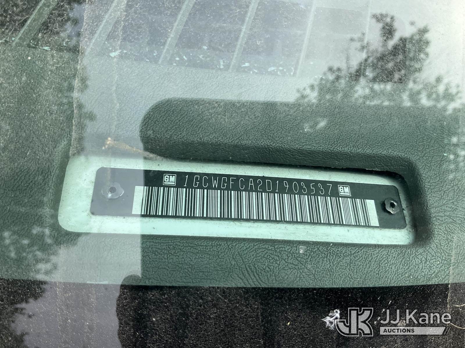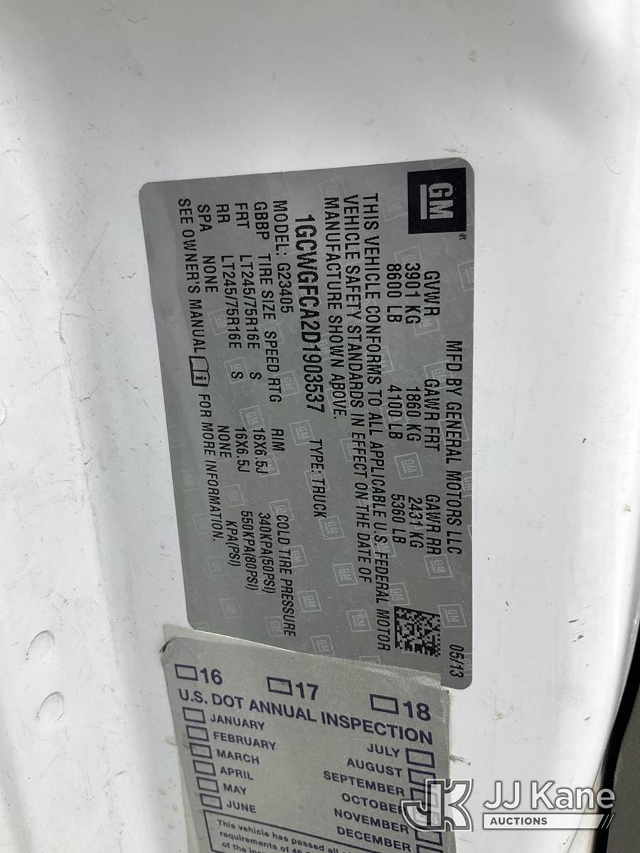 2013 Chevrolet Express 2500 Cargo Van, s/n 1GCWGFCA2D1903537, 4.8L V8 OHV 16V RWD, GAS, 6-Speed Automatic, A/C, (130,365 miles) (Runs & Moves)(Jump To Start) This is a Titled Item NOTE: This unit is being sold AS IS/WHERE IS via Timed Auction and is located in Dixon, CA. Inspection & preview days for this unit are the 2 business days prior to the first day of items closing for this auction, item is located at 8668 Sparling Ln Dixon, CA 95620 and hours of operations are 8a-4p. For pre-sale questions, please contact JJ Kane Staff at (707) 678-8060 (dixon@jjkane.com). Dealer License Number 45696. (Buyer is responsible for removal. Assistance by consignor or JJ Kane Auctions is not assured.)