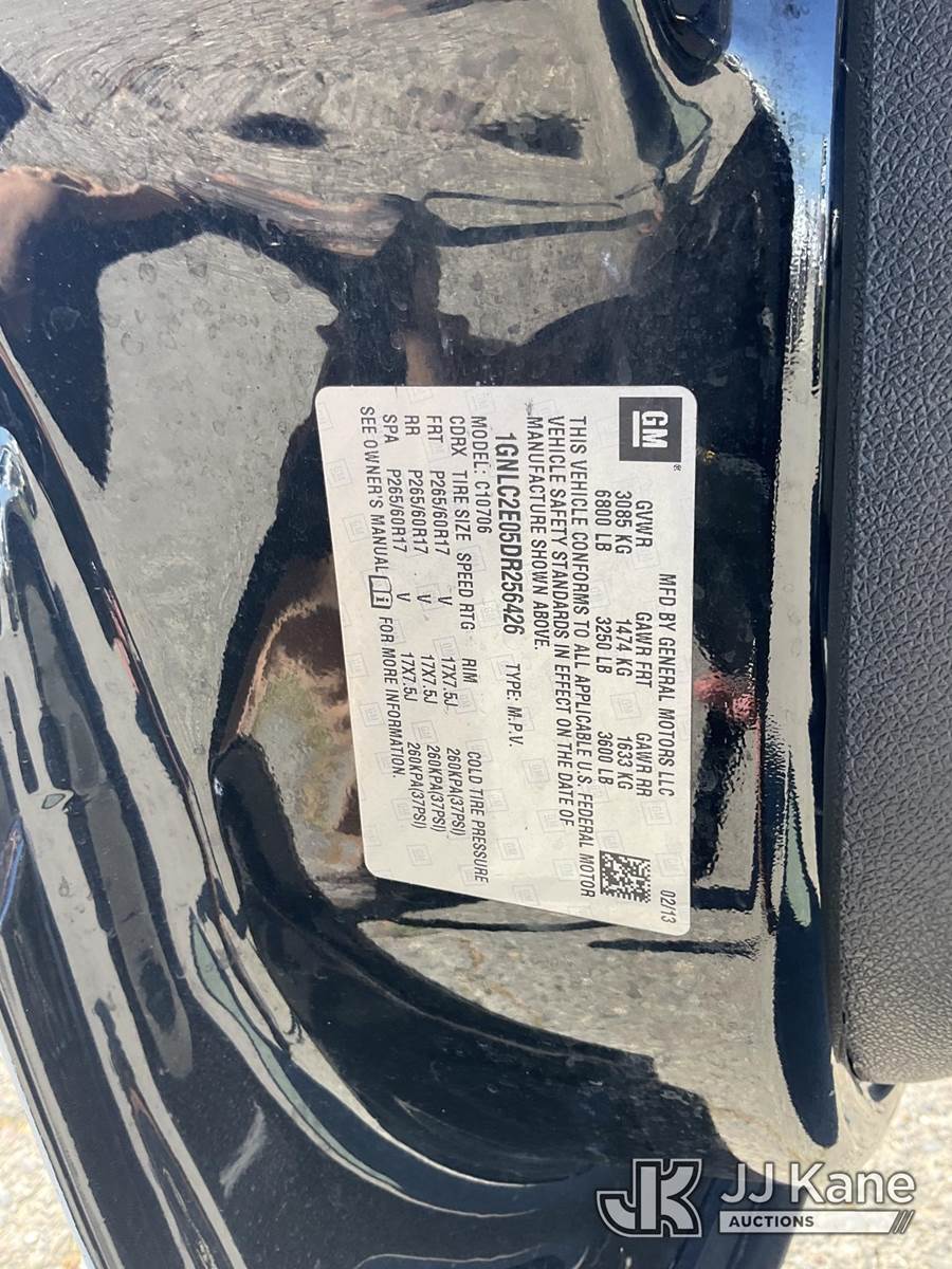 2013 Chevrolet Tahoe Police 4-Door Sport Utility Vehicle, s/n 1GNLC2E05DR256426, 5.3L V8 OHV 16V RWD, FFV, 6-Speed Automatic, A/C, with Push bar, (105,995 miles) (Runs & Moves, Check Engine Light On, Engine Code P015D) (Bidding Restricted to Licensed Vehicle Dealers Only), This is a Titled Item NOTE: This unit is being sold AS IS/WHERE IS via Timed Auction and is located in Dixon, CA. Inspection & preview days for this unit are the 2 business days prior to the first day of items closing for this auction, item is located at 8668 Sparling Ln Dixon, CA 95620 and hours of operations are 8a-4p. For pre-sale questions, please contact JJ Kane Staff at (707) 678-8060 (dixon@jjkane.com). Dealer License Number 45696. (Buyer is responsible for removal. Assistance by consignor or JJ Kane Auctions is not assured.)