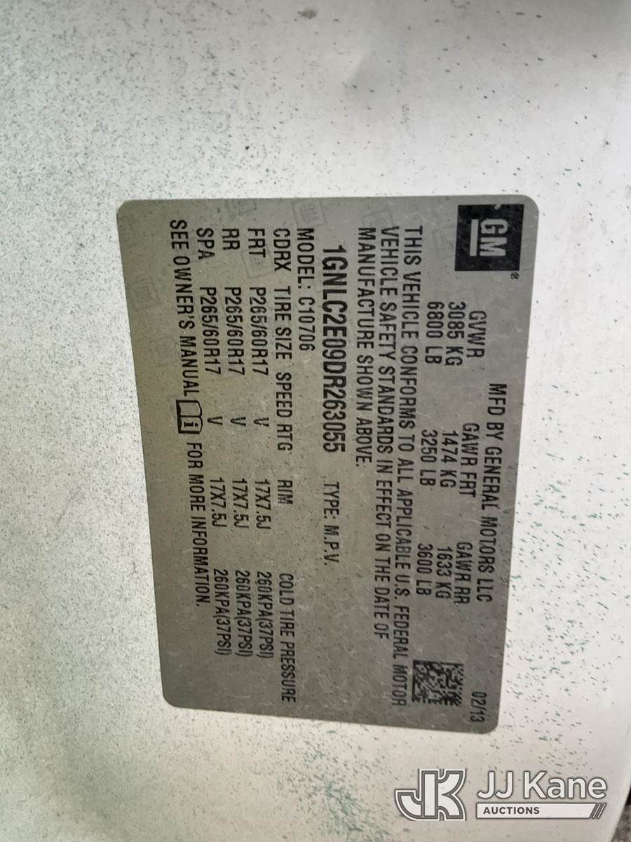 2013 Chevrolet Tahoe Police Package 4-Door Sport Utility Vehicle, 5.3L V8 OHV 16V FFV gas, RWD, 6-Speed Automatic, A/C, (143,812 miles) Former Police Vehicle, Alachua County Sheriff's Office Unit (Runs & Moves) (Body/Paint Damage) (Branded Title - Police Vehicle) This is a Titled Item NOTE: This unit is being sold AS IS/WHERE IS via Timed Auction and is located in Ocala, FL. Inspection & preview days for this unit are by appointment only; please contact us at contact@jjkane.com or 84-Go-JJKane for more details. For more information & removal arrangements please contact Mike Lessard @ (352) 629-6677. (Buyer is responsible for removal. Assistance by consignor or JJ Kane Auctions is not assured.)