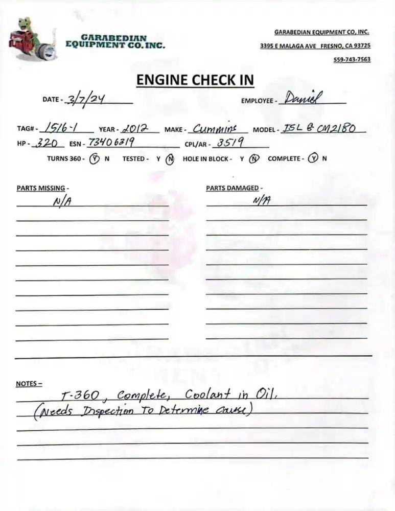 ISL G CM2180, 300 HP, S/N 73013411, CPL 3297, DOM 2009, Complete. Turns Partially (Need To Verify).