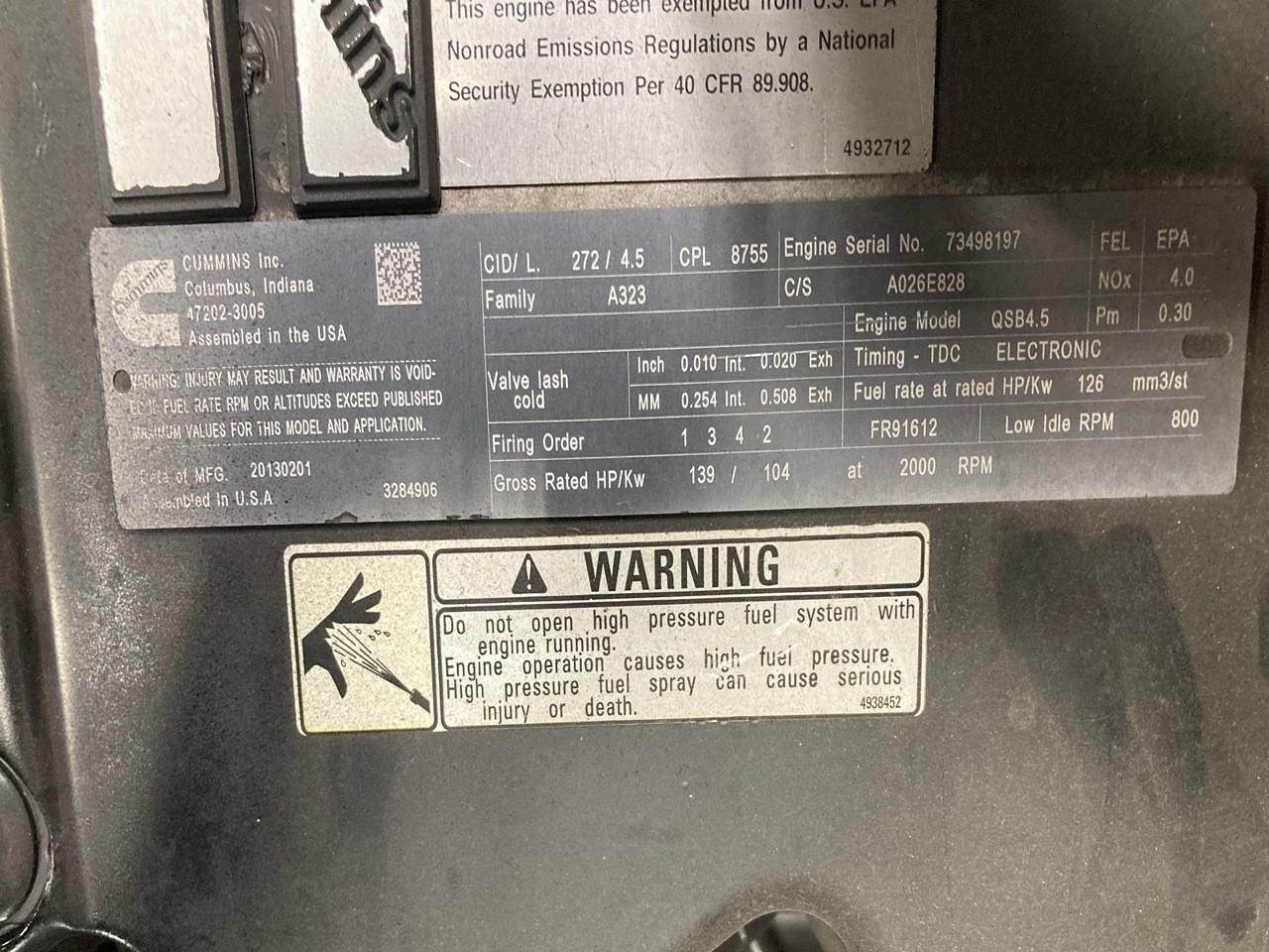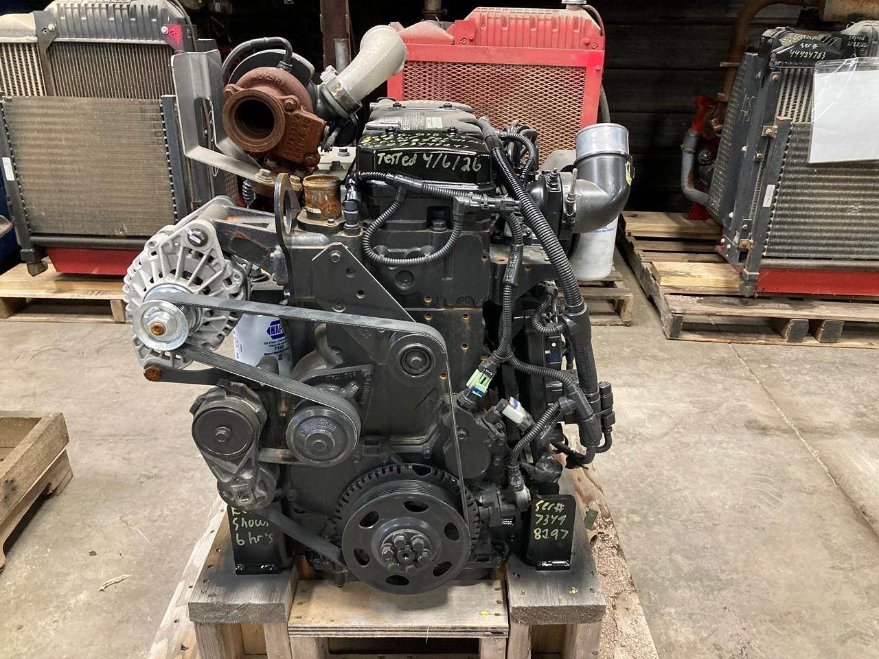 GOOD USED, 2013 CUMMINS QSB4.5 DIESEL TAKEOUT ENGINE FOR SALE at ADELMAN’S in OHIO. ONLY 6 HOURS SHOWING ON ECM! RUN TESTED and COMPLETE with ECM, FLYWHEEL, STARTER, and ALTERNATOR, 139 HP @ 2000 RPM, TIER 3 EMISSIONS, CPL # 8755, CM850 FUEL SYSTEM, and 70+ LBS OIL PRESSURE.