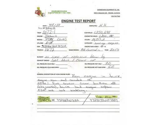 DD15, 455 HP, S/N 472906S0270312, 1,250,817 Odometer Miles 1,250,692 ECM Miles. Engine Complete And Runs Good. No Signs Of Excessive Blowby. Light Black Smoke But Clears Up. Engine Replaced And Not Original Engine From Truck. (see Video Of Engine Runn