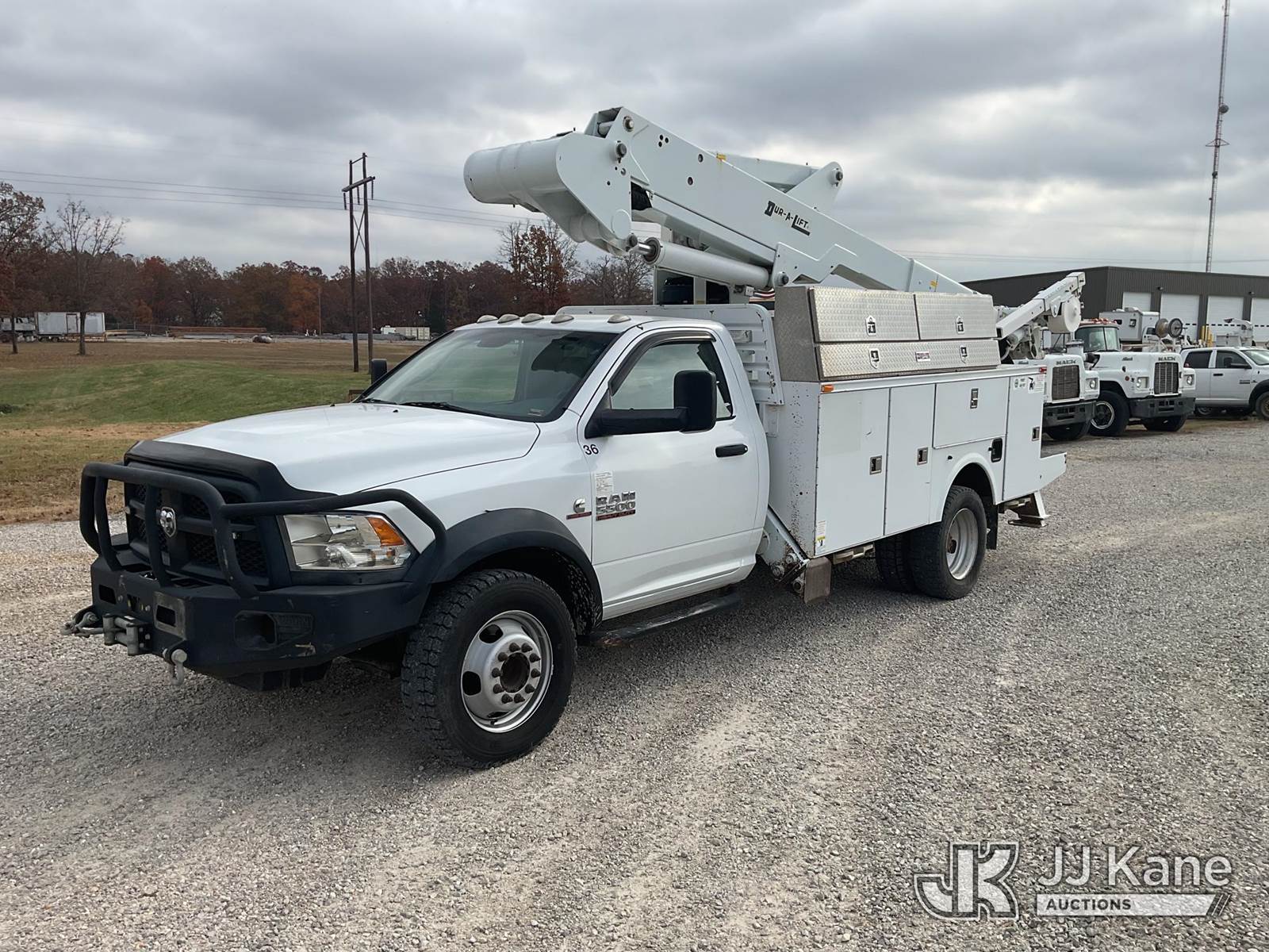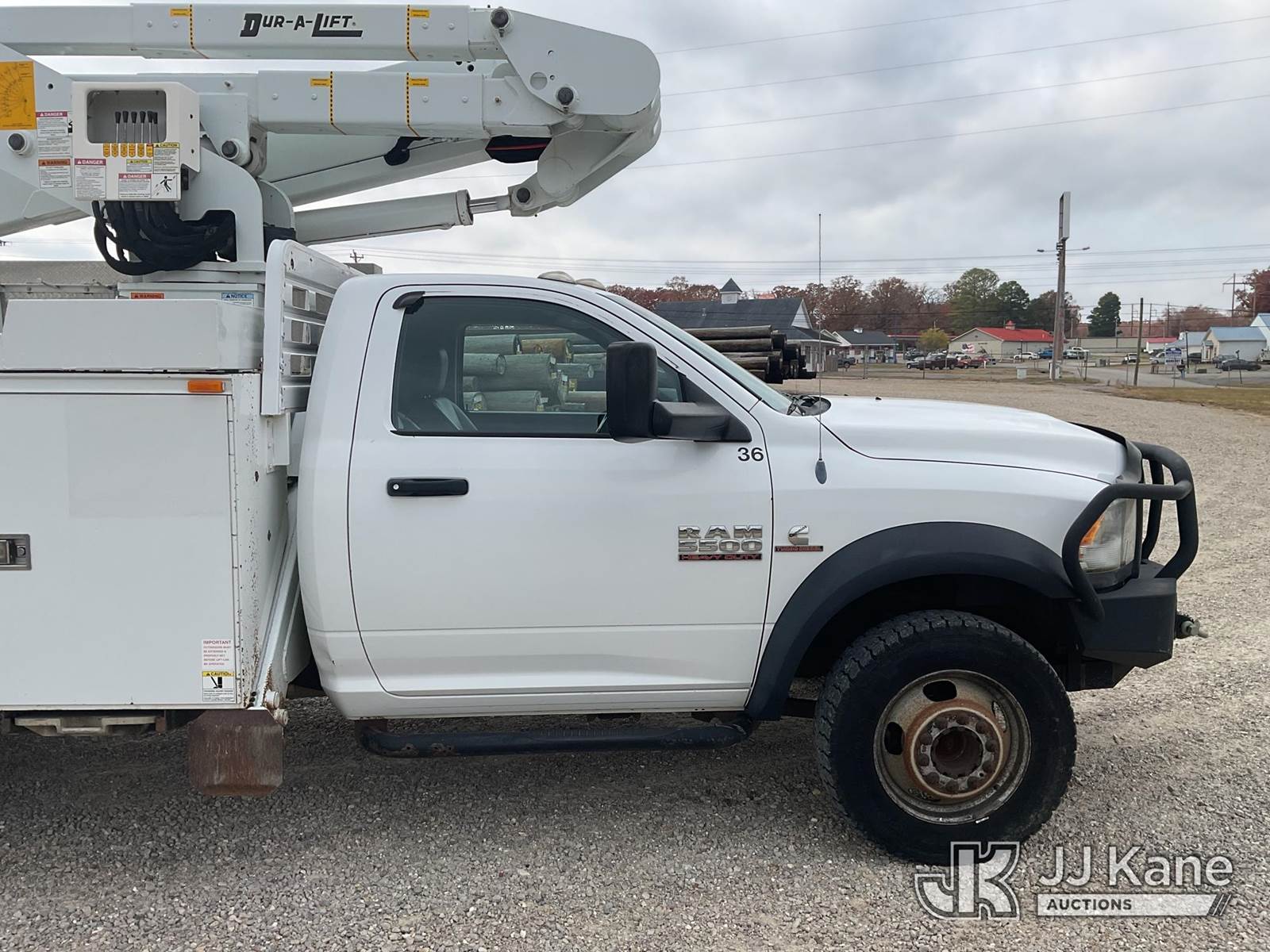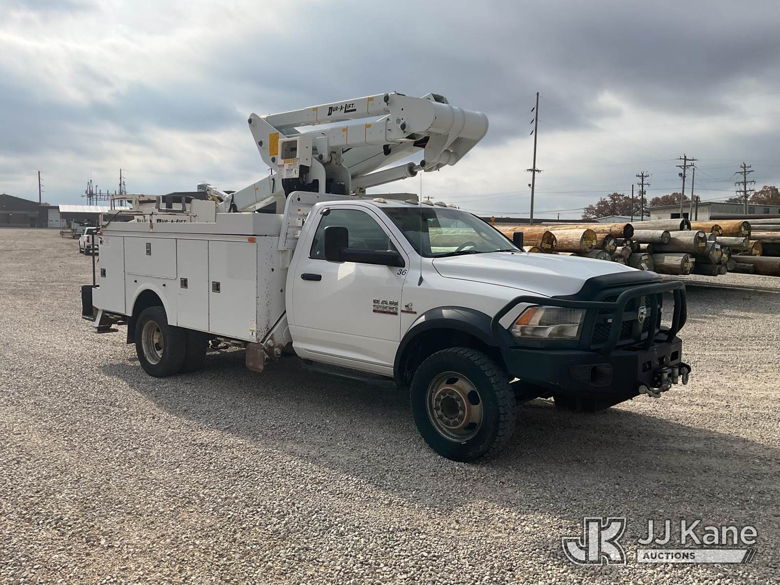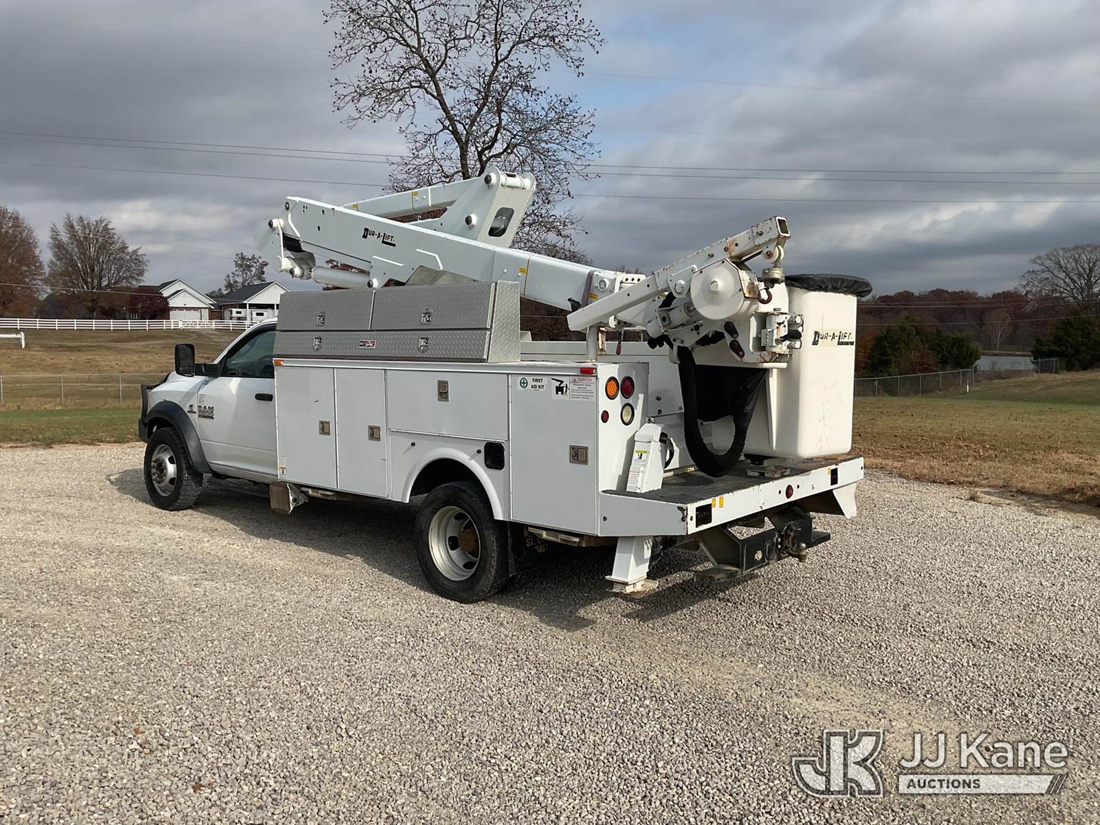Duralift DPM40MH, 45 ft, Articulating & Telescopic Material Handling Bucket Truck s/n A9198, with single-man bucket, four hyd. outriggers, mounted behind cab on 2013 RAM 5500 Regular Cab Service Truck, 6.7L L6 OHV 24V Turbo Diesel Auto, 4wd, A/C, with front winch, aftermarket front bumper, (167,690 miles) (Runs, Moves, & Upper Operates) This is a Titled Item NOTE: This unit is being sold AS IS/WHERE IS via Timed Auction and is located in Poplar Bluff, MO. Inspection & preview days for this unit are the 2 business days prior to the first day of items closing for this auction, hours of operations are 7am-12pm. For pre-sale questions, please contact Mike Munnelly @ (417) 496-5889. (Buyer is responsible for removal. Assistance by consignor or JJ Kane Auctioneers is not assured.)