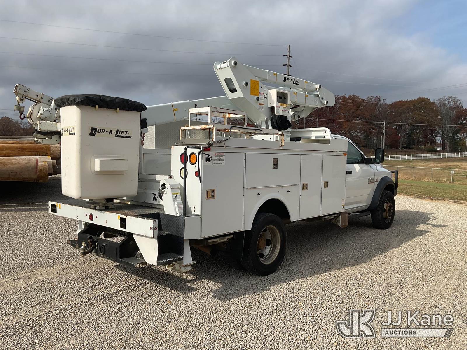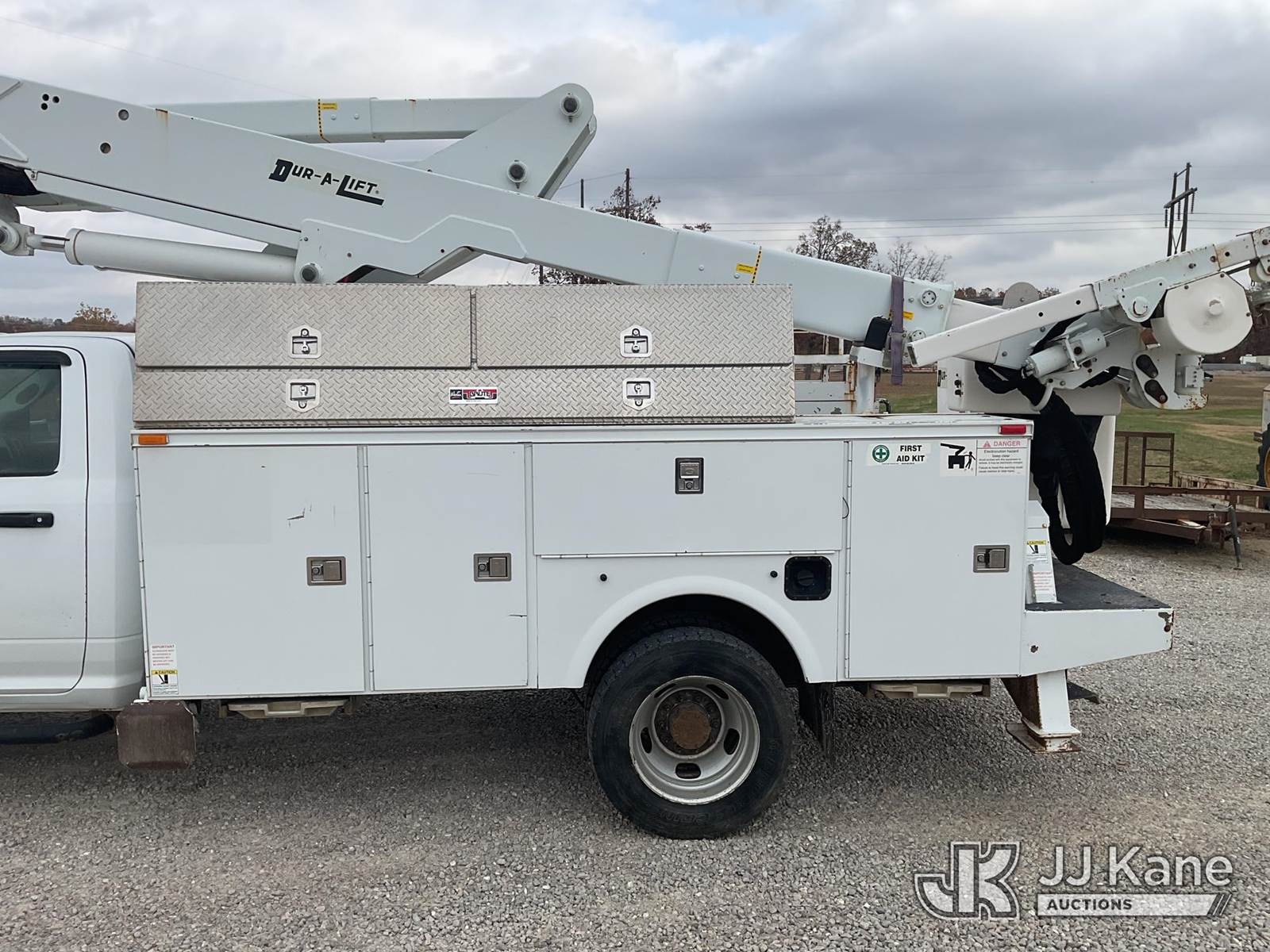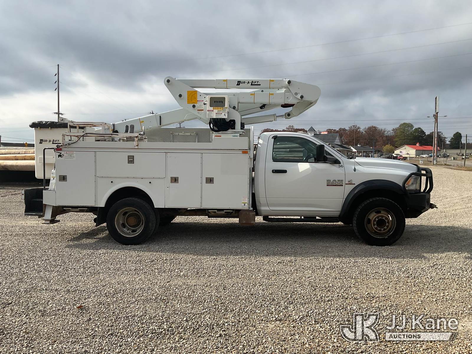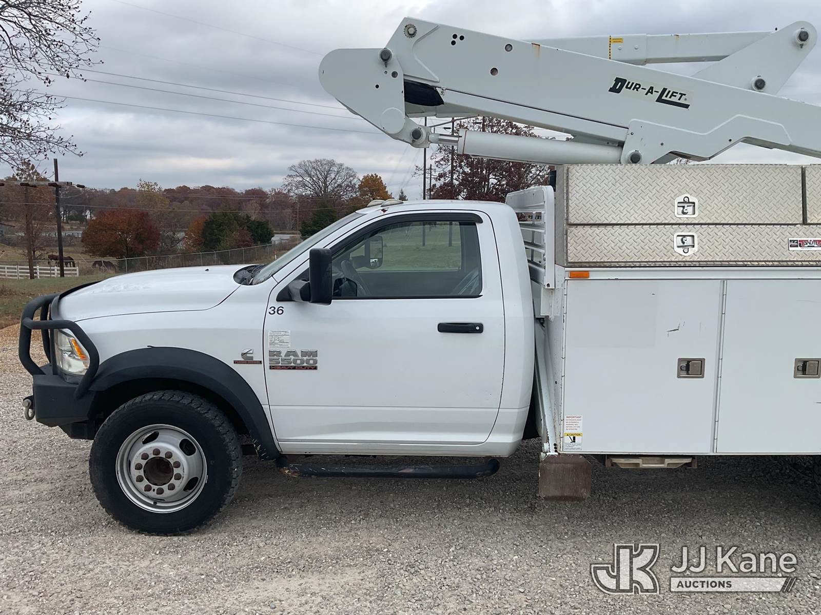 Duralift DPM40MH, 45 ft, Articulating & Telescopic Material Handling Bucket Truck s/n A9198, with single-man bucket, four hyd. outriggers, mounted behind cab on 2013 RAM 5500 Regular Cab Service Truck, 6.7L L6 OHV 24V Turbo Diesel Auto, 4wd, A/C, with front winch, aftermarket front bumper, (167,690 miles) (Runs, Moves, & Upper Operates) This is a Titled Item NOTE: This unit is being sold AS IS/WHERE IS via Timed Auction and is located in Poplar Bluff, MO. Inspection & preview days for this unit are the 2 business days prior to the first day of items closing for this auction, hours of operations are 7am-12pm. For pre-sale questions, please contact Mike Munnelly @ (417) 496-5889. (Buyer is responsible for removal. Assistance by consignor or JJ Kane Auctioneers is not assured.)