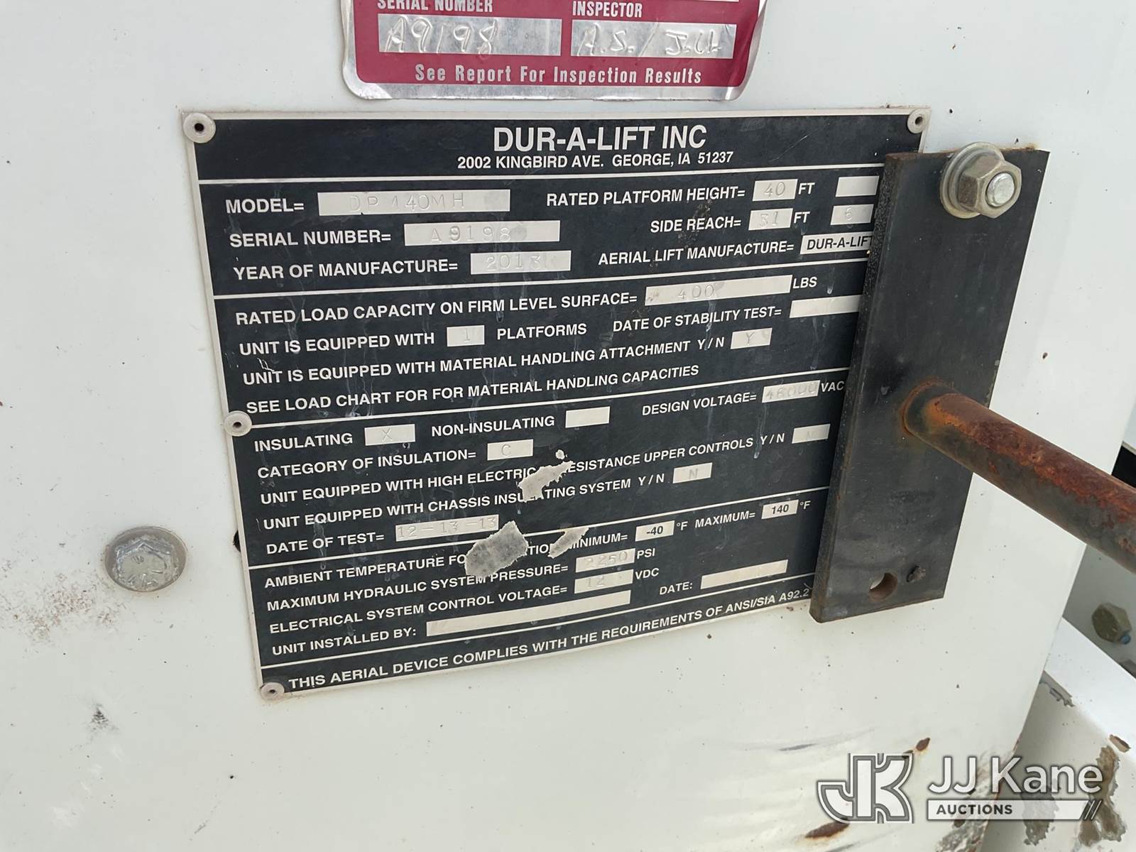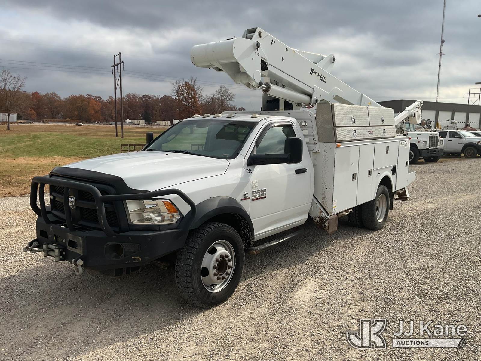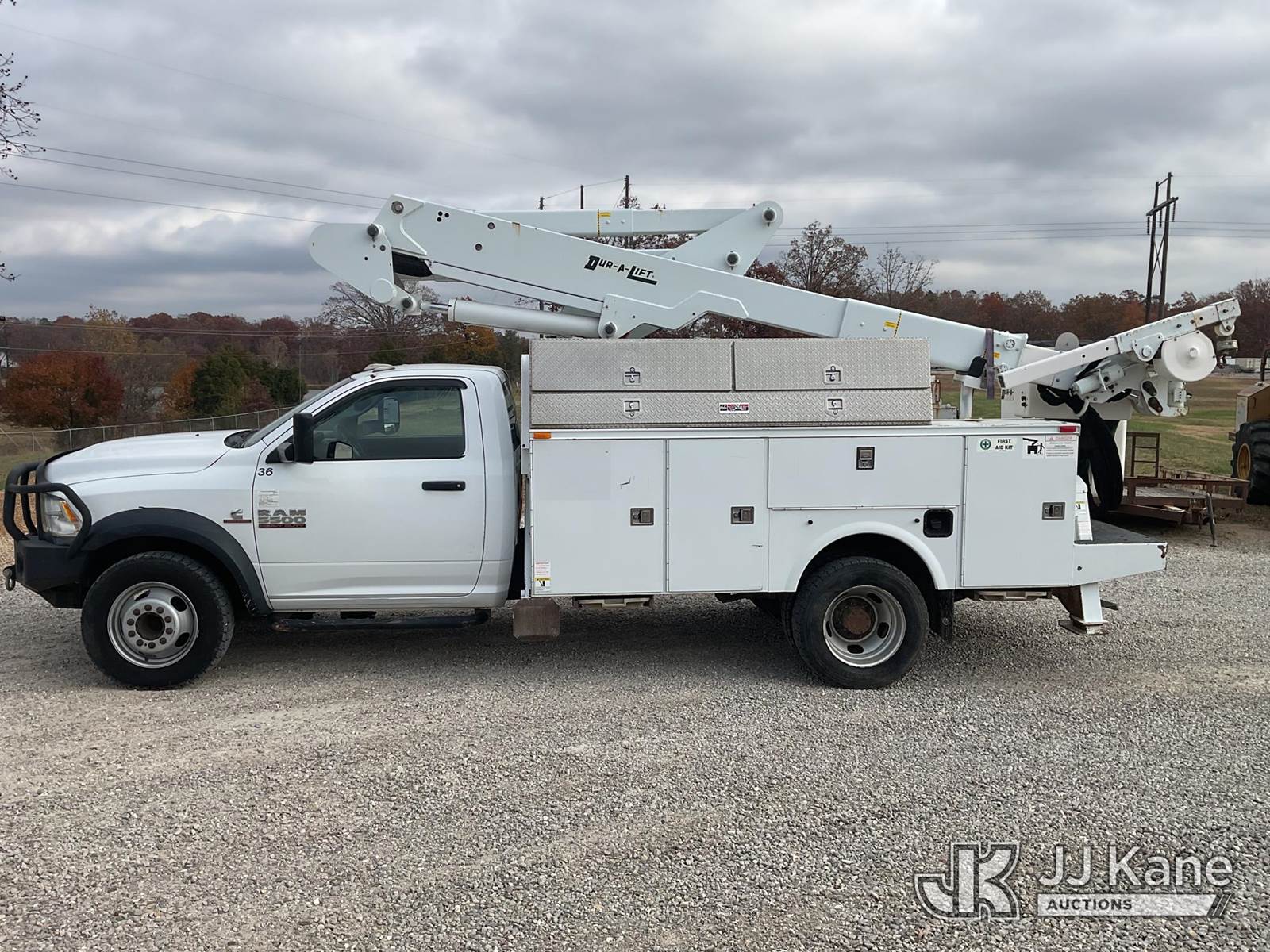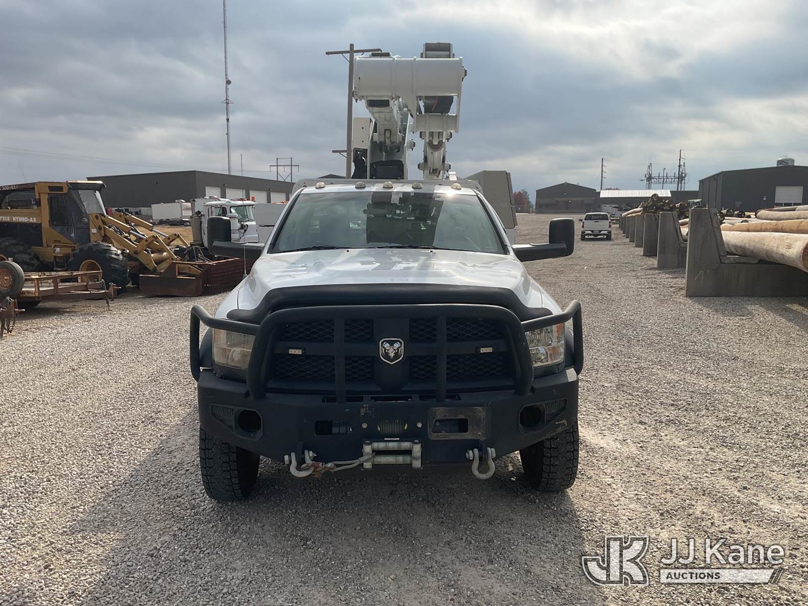 Duralift DPM40MH, 45 ft, Articulating & Telescopic Material Handling Bucket Truck s/n A9198, with single-man bucket, four hyd. outriggers, mounted behind cab on 2013 RAM 5500 Regular Cab Service Truck, 6.7L L6 OHV 24V Turbo Diesel Auto, 4wd, A/C, with front winch, aftermarket front bumper, (167,690 miles) (Runs, Moves, & Upper Operates) This is a Titled Item NOTE: This unit is being sold AS IS/WHERE IS via Timed Auction and is located in Poplar Bluff, MO. Inspection & preview days for this unit are the 2 business days prior to the first day of items closing for this auction, hours of operations are 7am-12pm. For pre-sale questions, please contact Mike Munnelly @ (417) 496-5889. (Buyer is responsible for removal. Assistance by consignor or JJ Kane Auctioneers is not assured.)