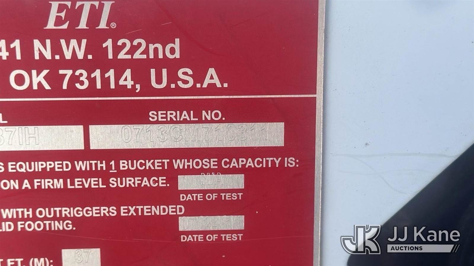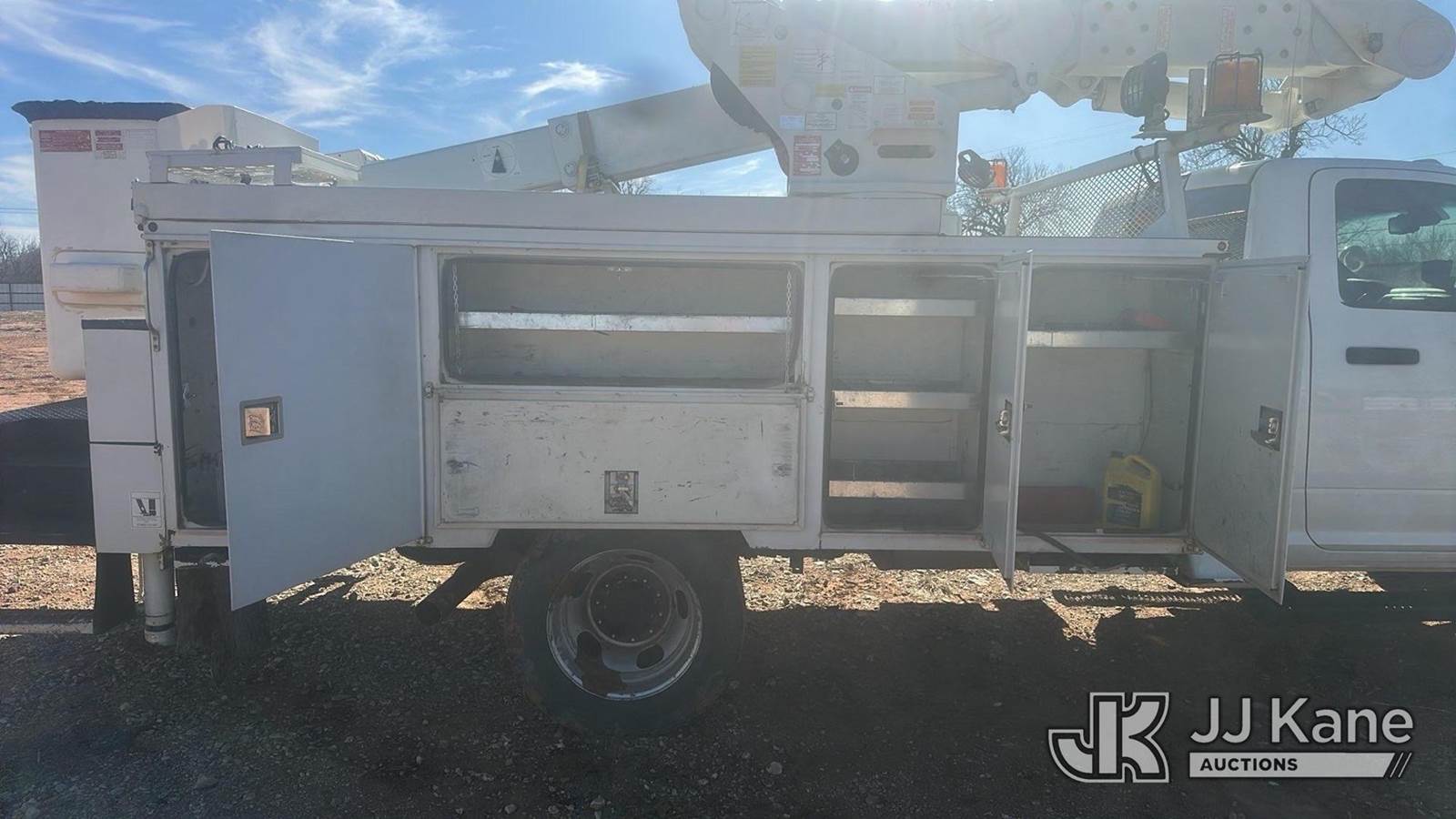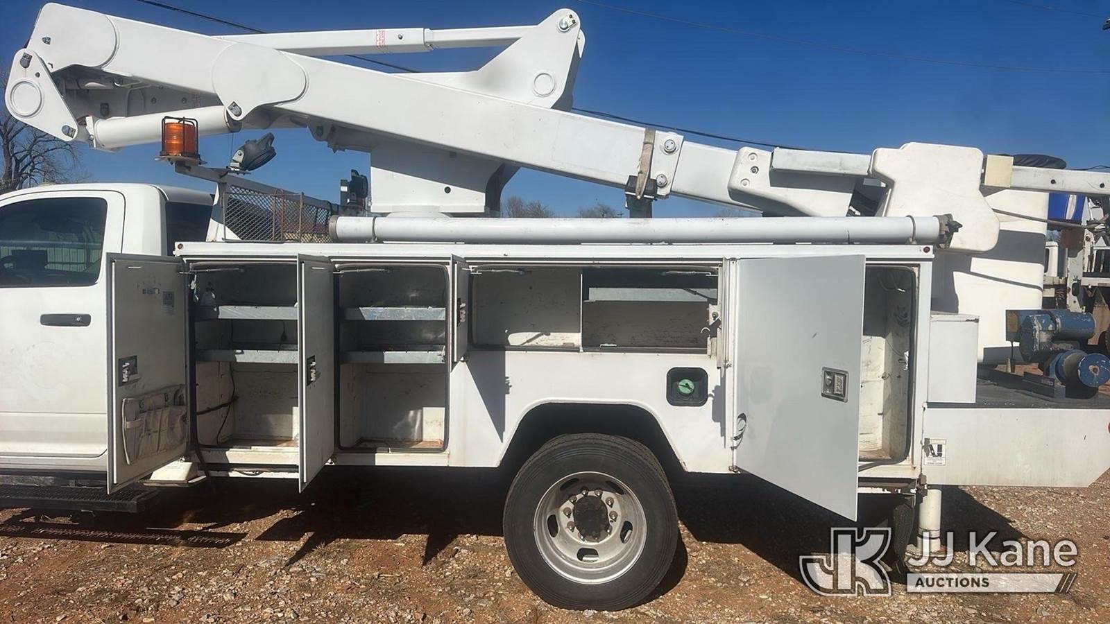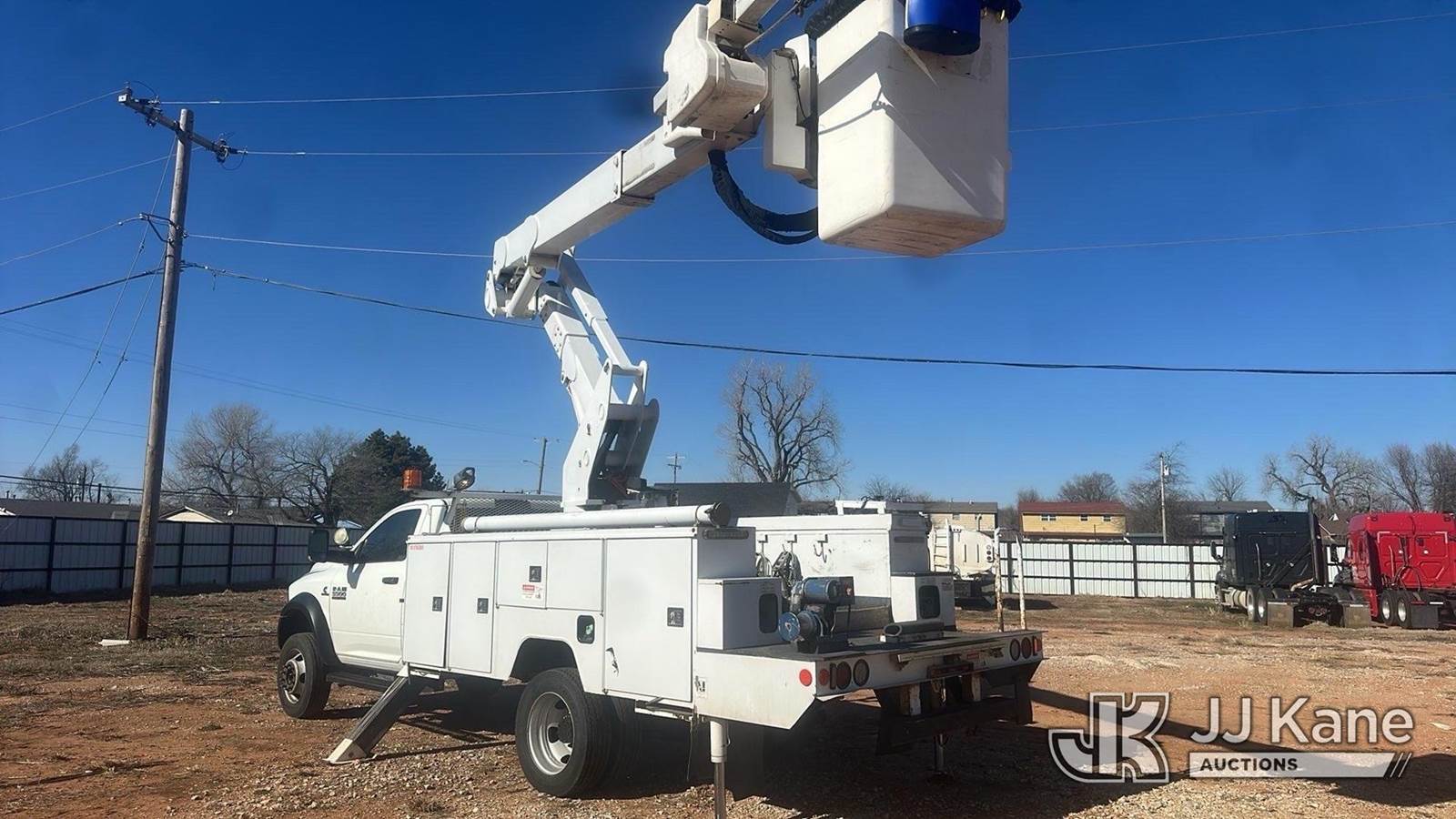 ETI ETCMH37-IH, 42 ft, Articulating & Telescopic Material Handling Bucket Truck s/n 0713CM710311, with single man bucket, mounted behind cab on 2013 RAM 5500 Service Truck, 6.7L diesel, 4WD, Auto, A/C, (200,662 miles) (Runs, Moves & Upper Operates)(Check Engine Light On)(Seller States: Truck Has A Damaged High Pressure Fuel Pump. Metal Intrusion In High Pressure Fuel Rails, Lines And Injectors. Truck Currently Runs. Does Has Intermittent Performance Issue Under Load Due To Fueling Issues) This is a Titled Item NOTE: This unit is being sold AS IS/WHERE IS via Timed Auction and is located in Oklahoma City, OK. Inspection & preview days for this unit are by appointment only; please contact us at contact@jjkane.com or 84-Go-JJKane for more details. (Missing manuals, See Auction Company for Manufacturers Information to obtain manuals) (Buyer is responsible for removal. Assistance by consignor or JJ Kane Auctions is not assured.)