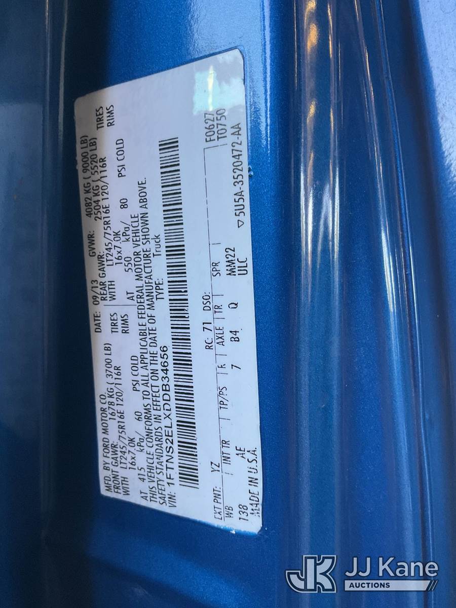 2013 Ford Econoline E-250 Extended Cargo Van, s/n 1FTNS2ELXDDB34656, 5.4L V8 SOHC 16V RWD, GAS, 4-Speed Automatic, A/C, with Tow package, (5,248 miles) (Runs & Moves, Airbag Deployed, Airbag Light On, Traction Control Light On, TCS Off Light On, Side Step Damaged) (Bidding Restricted to Licensed Vehicle Dealers Only), This is a Titled Item NOTE: This unit is being sold AS IS/WHERE IS via Timed Auction and is located in Jurupa Valley, CA. Inspection & preview days for this unit are the 2 business days prior to the first day of items closing for this auction, item is located at 4510 Muth Way Jurupa Valley, CA 92509 and hours of operations are 8a-4p. For pre-sale questions, please contact please contact Office Staff @ (310) 353-7140. Dealer License Number 45696. (Buyer is responsible for removal. Assistance by consignor or JJ Kane Auctions is not assured.)