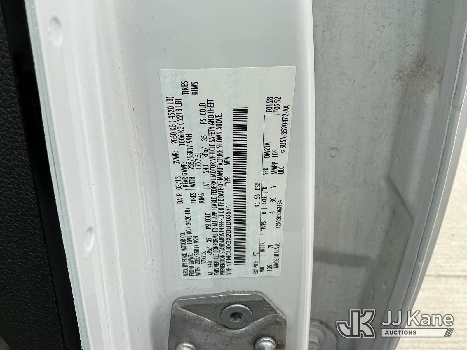 2013 Ford Escape 4-Door Sport Utility Vehicle, s/n 1FMCU0GX2DUD03571, 1.6L L4 DOHC 16V Gas 6-Speed Automatic, FWD, A/C, (96,602 miles) (Runs & Moves) (Check Engine Light On, Overheats, Runs Rough) (Bidding Restricted to Licensed Vehicle Dealers Only), This is a Titled Item NOTE: This unit is being sold AS IS/WHERE IS via Timed Auction and is located in Dixon, CA. Inspection & preview days for this unit are the 2 business days prior to the first day of items closing for this auction, item is located at 8668 Sparling Ln Dixon, CA 95620 and hours of operations are 8a-4p. For pre-sale questions, please contact JJ Kane Staff at (707) 678-8060 (dixon@jjkane.com). Dealer License Number 45696. (Buyer is responsible for removal. Assistance by consignor or JJ Kane Auctions is not assured.)