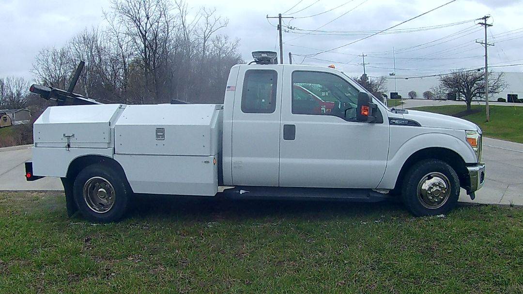 2013 Ford F350 Super Duty Battery service truck. 221510 miles on the 6.2L Triton V8 motor. 2WD automatic transmission. Runs great, equipped with Wheel lift, Battery storage bins. Tires in very good condition, all maintenance up to date, no major repairs known to have performed on the truck. Truck very clean inside and out. Real nice Service truck.