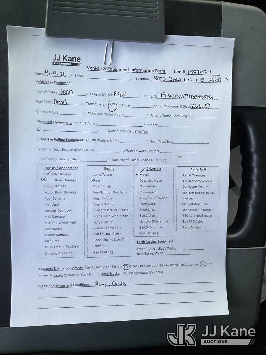 2013 Ford F-350 SD Crew-Cab Pickup Truck, 6.7L Diesel 4WD, 6-Speed Automatic, A/C, (262,653 miles) (Runs & Moves) This is a Titled Item NOTE: This unit is being sold AS IS/WHERE IS via Timed Auction and is located in Albuquerque, NM. For more information & removal arrangements please contact Armando Beltran @ 505-991-0312. (Buyer is responsible for removal. Assistance by consignor or JJ Kane Auctions is not assured.)