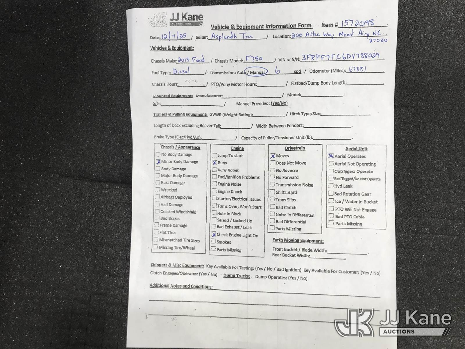 2013 Ford F-750 Chipper Dump Truck, 6.7L L6 diesel, 6-spd, 4X2, A/C, (67,881 miles) (Runs & Moves) (Check Engine Light On) (Per Seller: Has Starting Issues) This is a Titled Item NOTE: This unit is being sold AS IS/WHERE IS via Timed Auction and is located in Mount Airy, NC. Inspection & preview days for this unit are by appointment only; please contact us at contact@jjkane.com or 84-Go-JJKane for more details. (Buyer is responsible for removal. Assistance by consignor or JJ Kane Auctioneers is not assured.)