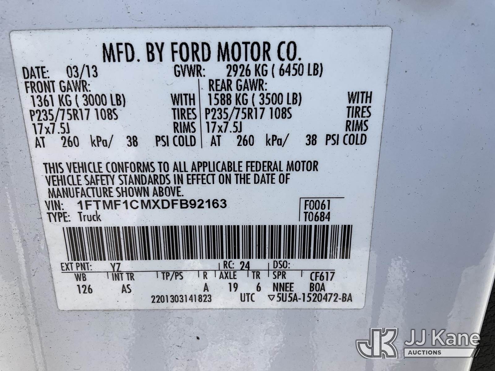 2013 Ford F150 Pickup Truck, 6-cyl gas, RWD, Auto, A/C, (41,808 miles) (Runs & Moves) (FL Residents Purchasing Titled Items – tax, title & registration fees will be collected at the maximum rate of $400.00 under 25,999 and $800.00 for Over 26,000 and $250.00 for Trailers – Proof of insurance is mandatory; Out of State Residents Purchasing Title Items – tax will be collected based upon your state rate) This is a Titled Item NOTE: This unit is being sold AS IS/WHERE IS via Timed Auction and is located in West Palm Beach, FL. For Pick Up & Removal information, please contact: Andy Garcia @ 561-215-0085. Removals require 24-hr Notice by Appointment Only, Buyer/Hauler must present copy of Paid-in-Full JJ Kane Release Form upon arrival. Purchaser acknowledges ALL lots must be removed within 10 business days of Auction, or a towing & storage fee may be incurred. (Buyer is responsible for removal. Assistance by consignor or JJ Kane Auctions is not assured.)