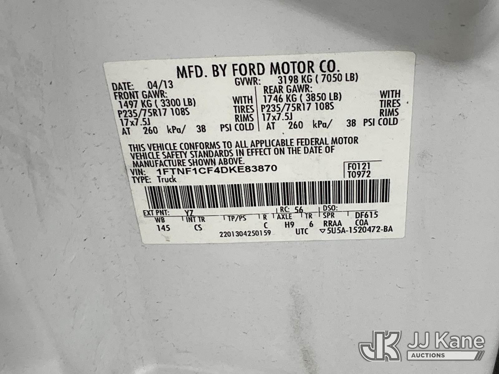 2013 Ford F150 Pickup Truck, 8-cyl gas, Auto, A/C, (149,062 miles) (Runs & Moves) This is a Titled Item NOTE: This unit is being sold AS IS/WHERE IS via Timed Auction and is located in Salt Lake City, UT. Inspection & preview days for this unit are the 2 business days prior to the first day of items closing for this auction, item is located at 2353 N Redwood Rd Salt Lake City, UT 84116 and hours of operations are 8a-4p. Titles executed exactly as bidder registered. Ensure your name and/or business name and address in JJ Kane and/or ProxiBid is correct before bidding. For pre-sale questions, please contact Office Staff @ (801) 519-0123. (Buyer is responsible for removal. Assistance by consignor or JJ Kane Auctions is not assured.)
