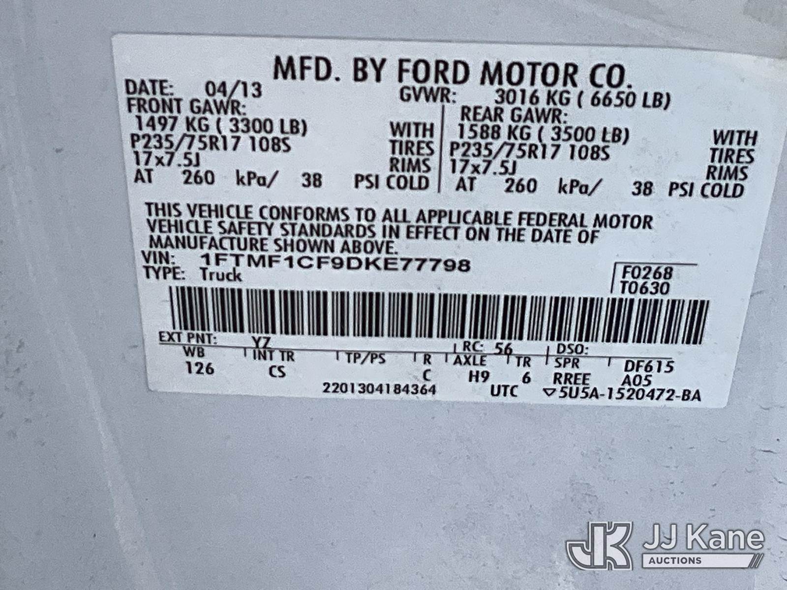 2013 Ford F150 Pickup Truck, 8-cyl gas, Auto, A/C, (162,917 miles) (Runs & Moves) This is a Titled Item NOTE: This unit is being sold AS IS/WHERE IS via Timed Auction and is located in Salt Lake City, UT. Inspection & preview days for this unit are the 2 business days prior to the first day of items closing for this auction, item is located at 2353 N Redwood Rd Salt Lake City, UT 84116 and hours of operations are 8a-4p. Titles executed exactly as bidder registered. Ensure your name and/or business name and address in JJ Kane and/or ProxiBid is correct before bidding. For pre-sale questions, please contact Office Staff @ (801) 519-0123. (Buyer is responsible for removal. Assistance by consignor or JJ Kane Auctions is not assured.)