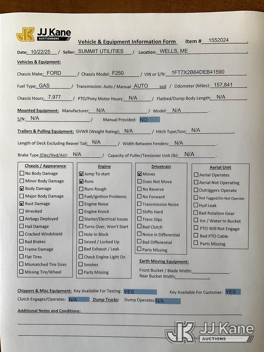 2013 Ford F250 4x4 Extended-Cab Pickup Truck, 8-cyl gas, Auto, A/C, (157,841 miles) (Jump to Start, Runs & Moves) (Rust Damage, Cab Corners on Wheel Wells Gone on Both Sides) This is a Titled Item NOTE: This unit is being sold AS IS/WHERE IS via Timed Auction and is located in Wells, ME. Inspection & preview days for this unit are by appointment only; please contact us at contact@jjkane.com or 84-Go-JJKane for more details. (Buyer is responsible for removal. Assistance by consignor or JJ Kane Auctioneers is not assured.)