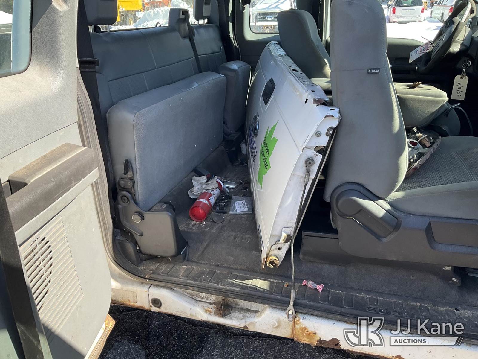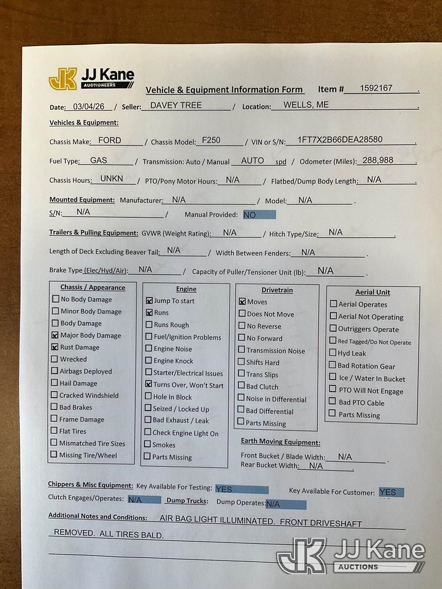 2013 Ford F250 4x4 Extended-Cab Pickup Truck, 8-cyl gas, Auto, A/C, (288,988 miles) (Runs & Moves, Jump To Start, Major Body Damage, Bed Strapped Down, Front Drive Shaft Out, Air Bag Light On, Engine Light On, All Tires Bad) (Removal is by Appointment Only, Buyer MUST make a appointment prior to picking up, Buyer/Transporter Must have PAID IN FULL RELEASE. No onsite assistance available, Please Come prepared.) This is a Titled Item NOTE: This unit is being sold AS IS/WHERE IS via Timed Auction and is located in Wells, ME. Inspection & preview days for this unit are by appointment only; please contact us at contact@jjkane.com or 84-Go-JJKane for more details. (Buyer is responsible for removal. Assistance by consignor or JJ Kane Auctions is not assured.)
