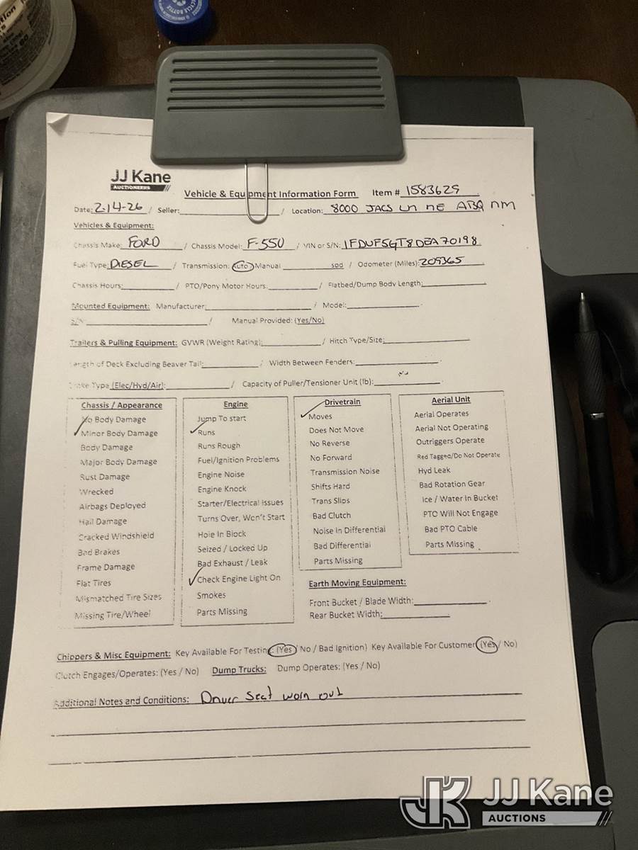 2013 Ford F550 Flatbed Truck, 6.7L V8 OHV 16V diesel, RWD, Auto, A/C, (209,365 miles) (Runs & Moves) (Check Engine Light On, Driver Side Seat Worn Out, Body Damage) This is a Titled Item NOTE: This unit is being sold AS IS/WHERE IS via Timed Auction and is located in Albuquerque, NM. Inspection & preview days for this unit are by appointment only; please contact us at contact@jjkane.com or 84-Go-JJKane for more details. (Buyer is responsible for removal. Assistance by consignor or JJ Kane Auctions is not assured.)