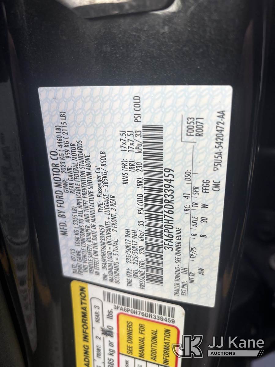 2013 Ford Fusion 4-Door Sedan, 2.5L L4 DOHC 16V gas, Auto, FWD, A/C, (70,665 miles) Municipal Owned & Maintained (Runs & Moves) This is a Titled Item NOTE: This unit is being sold AS IS/WHERE IS via Timed Auction and is located in Saint Charles, IL. For specific technical information or questions about this item, contact Dan Tomasek at (312)459-6627 or (dan.tomasek@jjkane.com). For load-out and pick information, reference the hauler sheet sent out after purchase. These items are used and may contain defects that are not immediately detectable. Text descriptions and photos given are meant to be used as a guide only. The conditions are provided by the consignor. The Buyer is responsible for inspecting the item before bidding. All information provided is believed to be correct but no warranty as such is either intended or implied. All items are sold AS IS - WHERE IS AND WITH ALL FAULTS AND DEFECTS THEREIN. (Buyer is responsible for removal. Assistance by consignor or JJ Kane Auctions is not assured.)