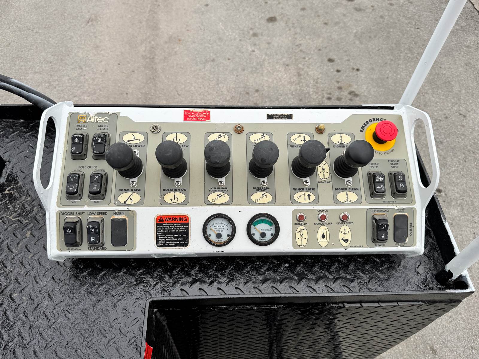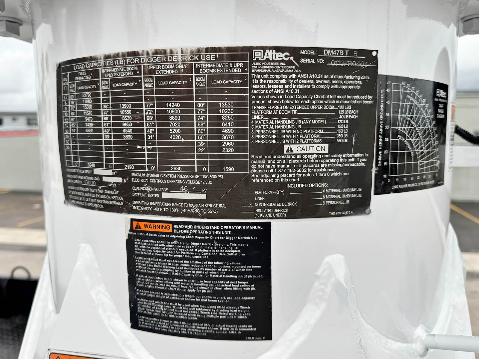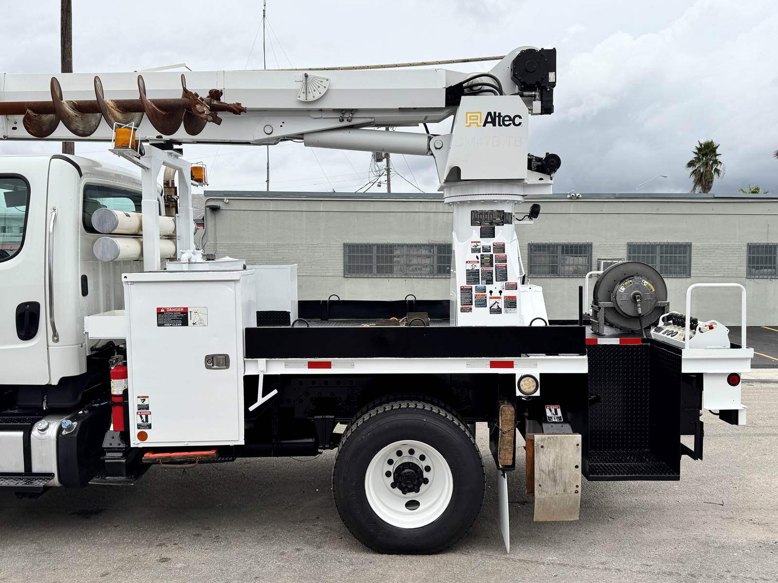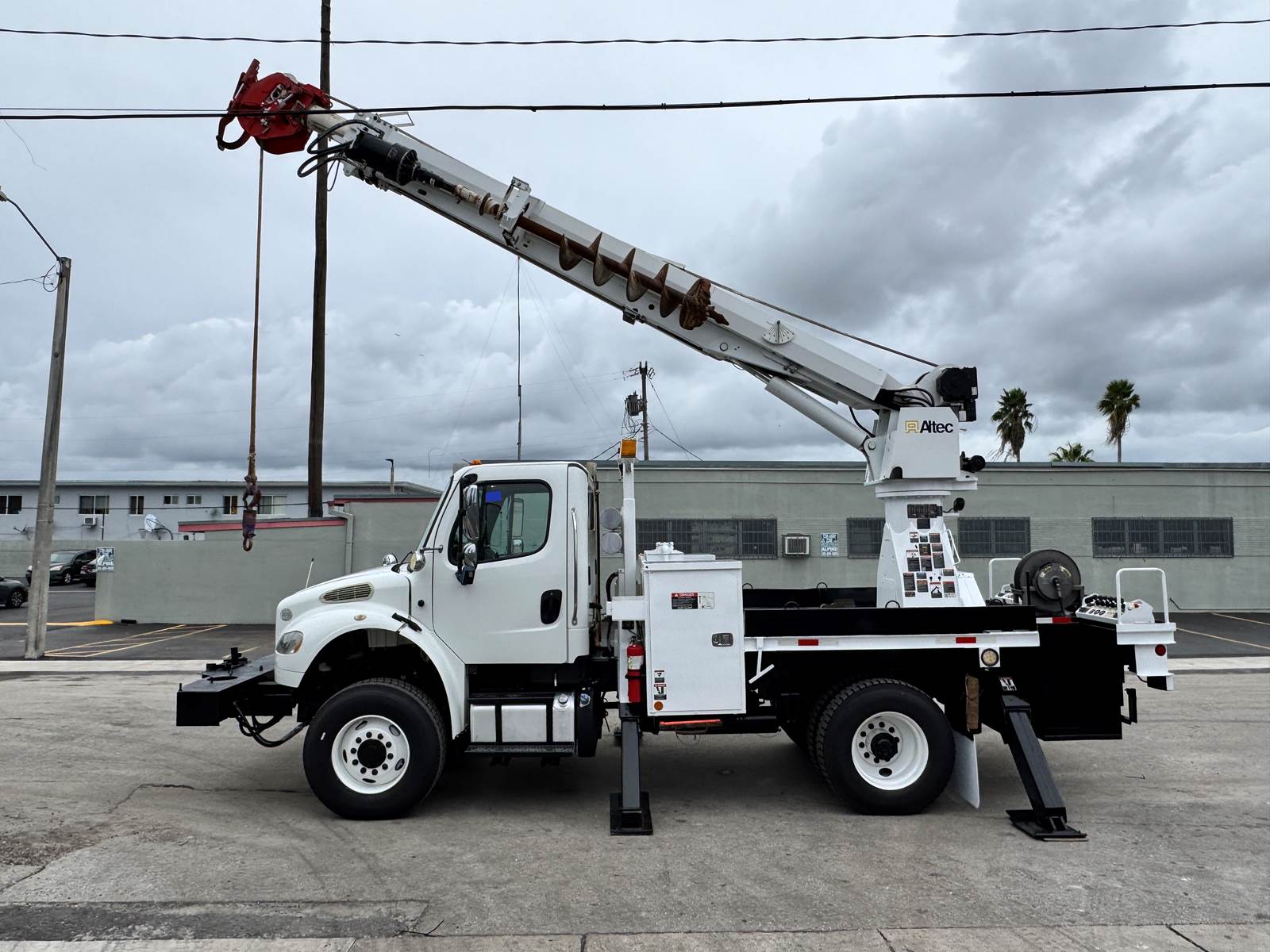 The Altec DM47B digger derrick features a 47-foot sheave height and 37.3-foot horizontal reach, supported by a robust three-section hydraulic telescopic boom. It includes an 18-inch auger, pole grab, and 2-speed digger drive system for efficient drilling and pole handling. The boom system offers continuous rotation and hydraulic side-load protection for operational precision and safety. Dual stand-up control consoles with multi-lever control and a high-flow piston pump ensure smooth hydraulic performance and responsive handling.