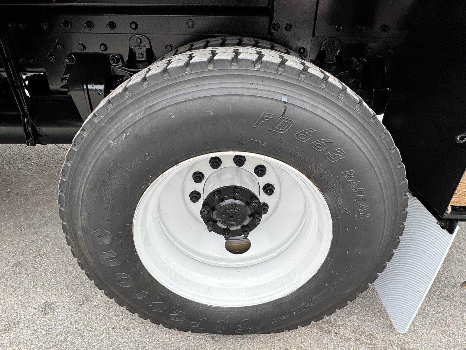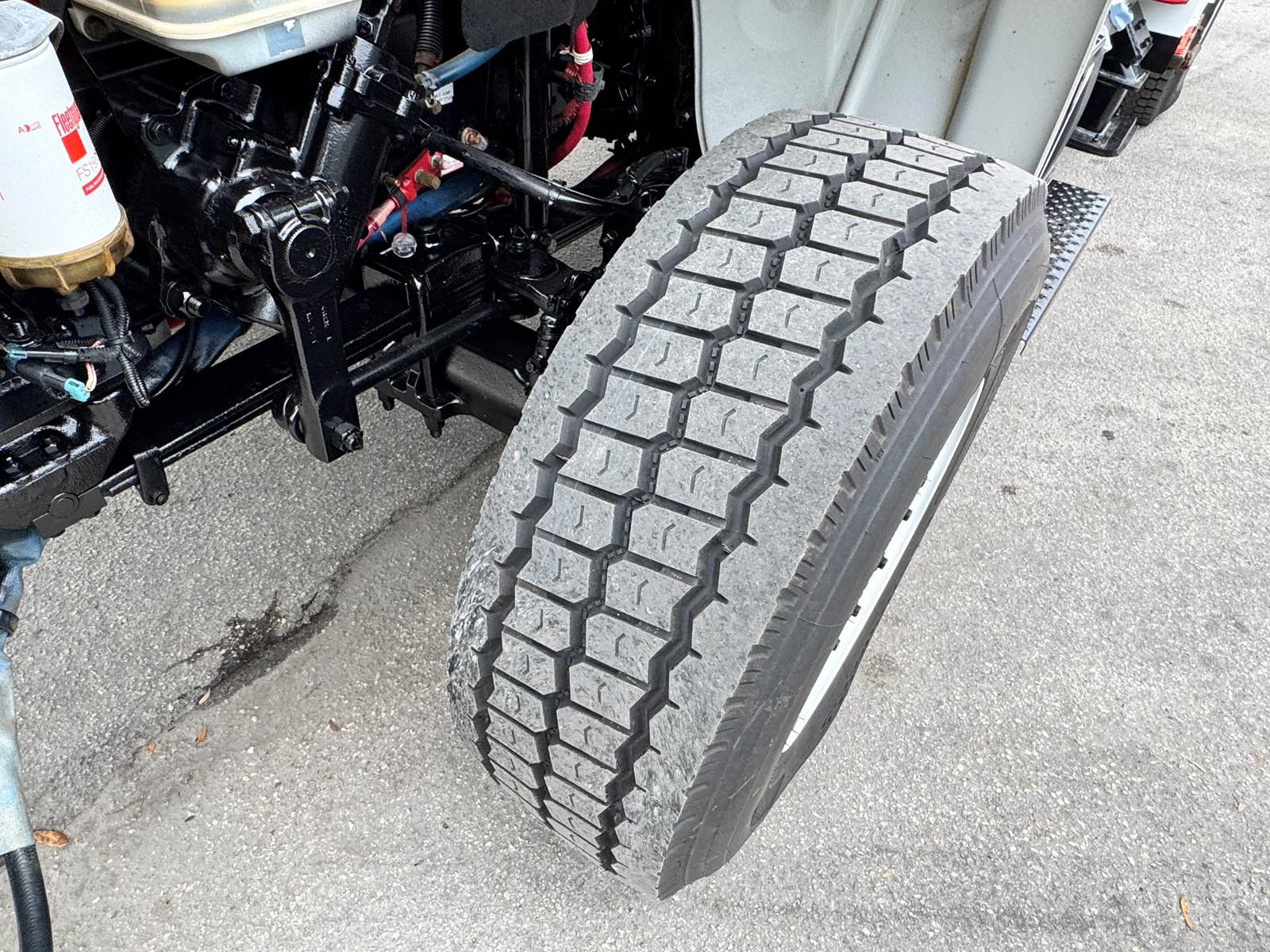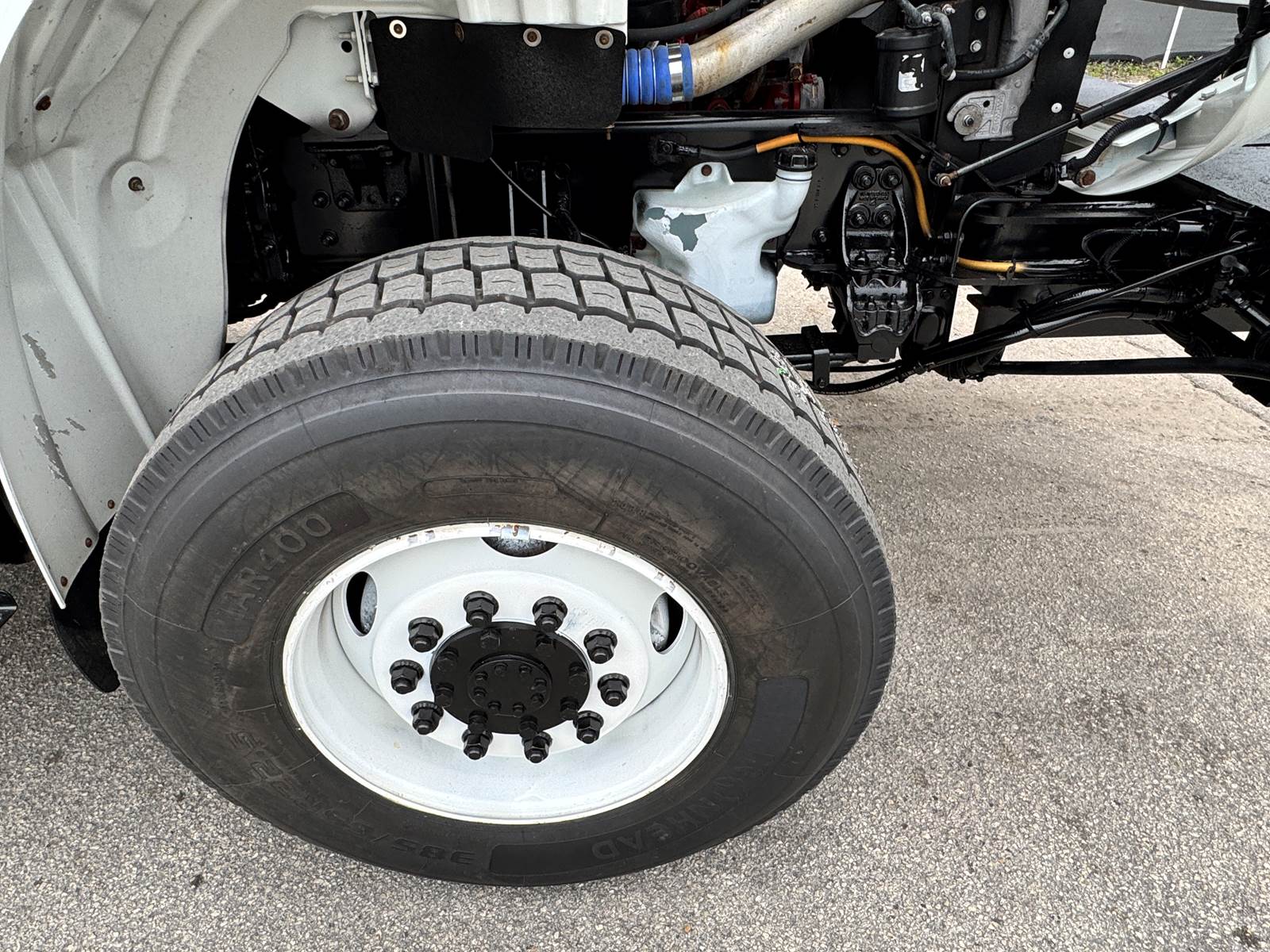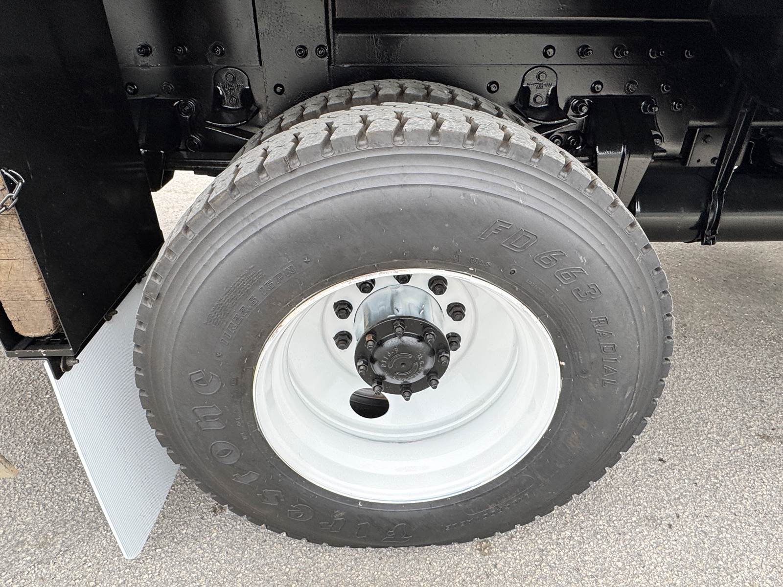 The chassis is configured with 4x4 drivetrain, low-range transfer case, and 4.89 rear axle ratio for maximum traction and torque in tough terrain. It’s equipped with spring front and air rear suspension, a single rear axle rated at 23,000 lbs, and a front axle rated at 16,000 lbs. The truck also includes a flatbed body with toolboxes, pintle hitch tow package, and a capstan winch, making it ideal for electric utility, telecom, or construction work.
