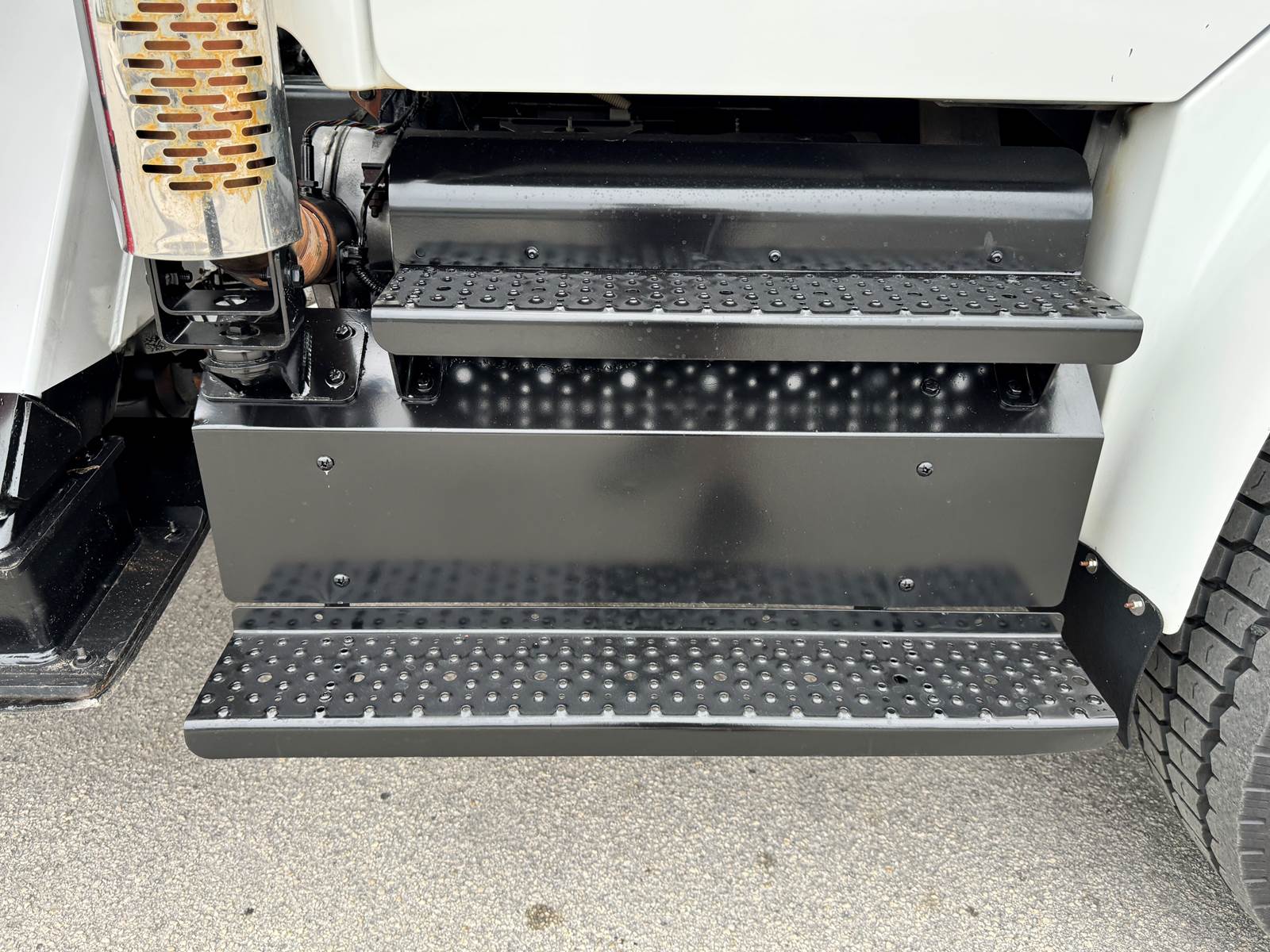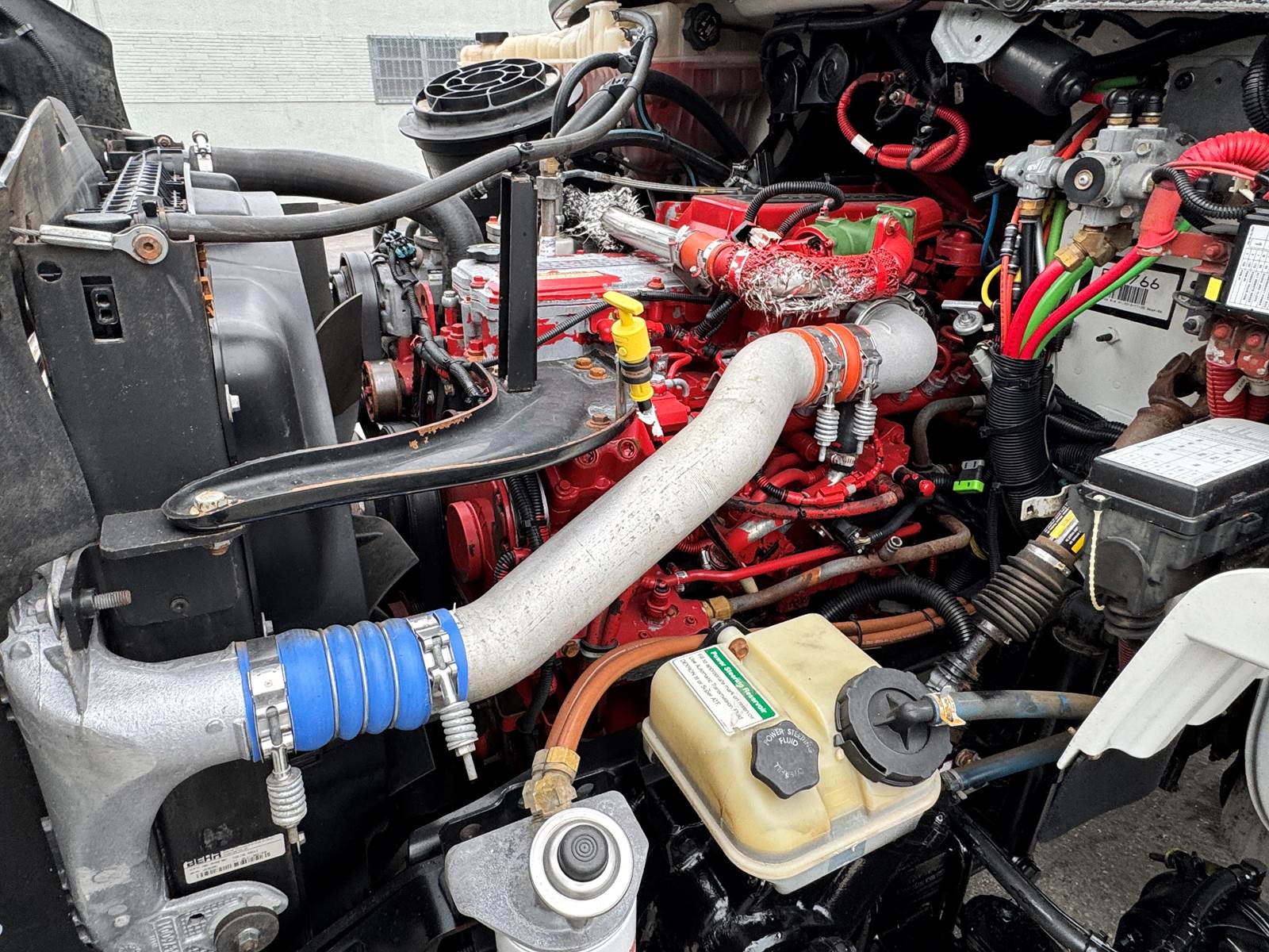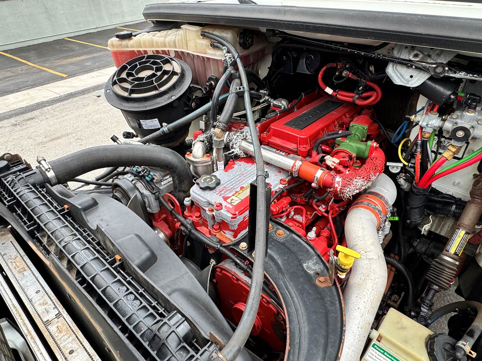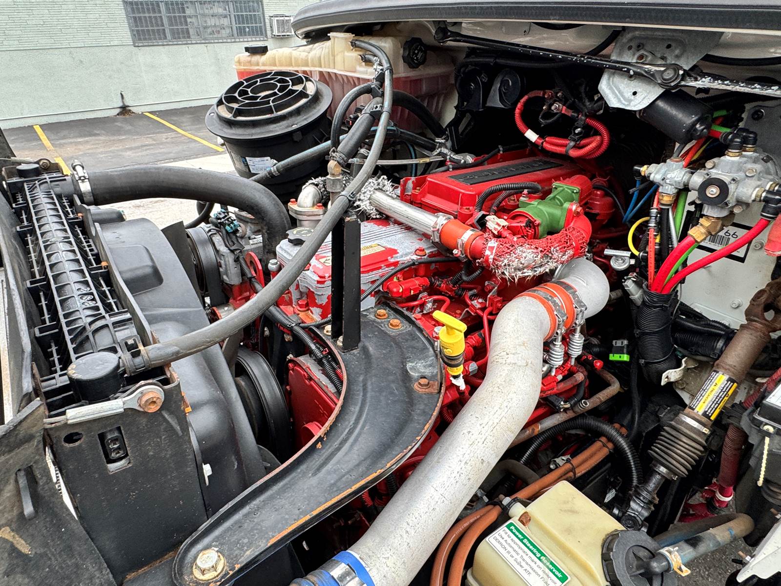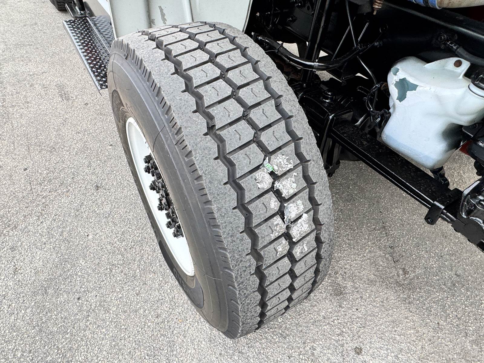 The chassis is configured with 4x4 drivetrain, low-range transfer case, and 4.89 rear axle ratio for maximum traction and torque in tough terrain. It’s equipped with spring front and air rear suspension, a single rear axle rated at 23,000 lbs, and a front axle rated at 16,000 lbs. The truck also includes a flatbed body with toolboxes, pintle hitch tow package, and a capstan winch, making it ideal for electric utility, telecom, or construction work.