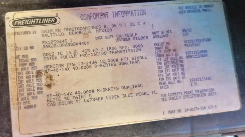 2013 Cascadia 125 Sleeper Cab, Complete, Wired for Detroit DD15 Engine and Eaton 10 Speed Transmission, Missing Passenger Seat but otherwise Complete