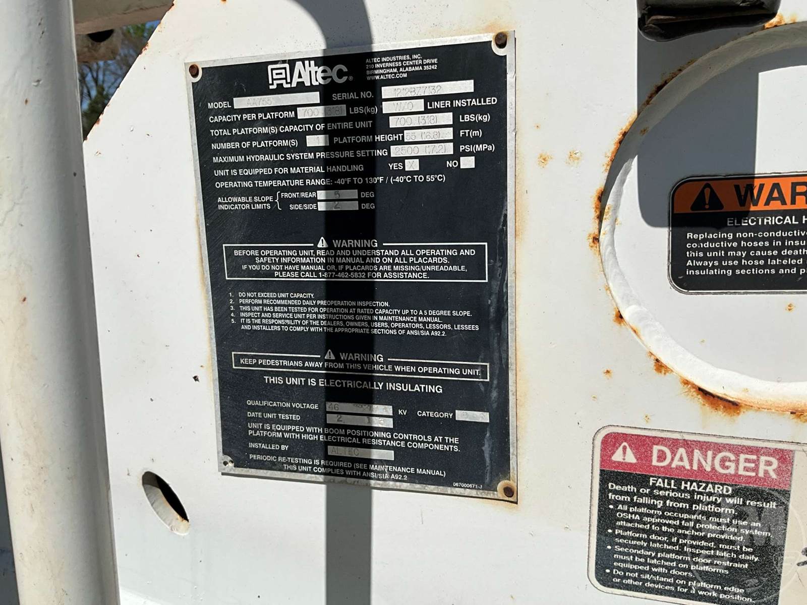 ALTEC AA755 BUCKET TRUCK, REAR MOUNT BOOM, BOOM SN 1212BZ7132, CUMMINS, ISB, SINGLE AXLE, AUTOMATIC, AWD, SPRING SUSPENSION, 192 " WB, WORK HEIGHT 55', UTILITY BODY, SINGLE MAN BUCKET, BOOM CAPACITY 700LBS, 4 HYDRAULIC OUTRIGGERS, 330000 GVWR, HOUR METER READS: 11786, ODOMETER READS: 111275