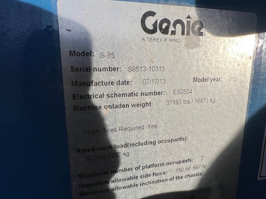 Location: Washougal WA ***End-User Consignment*** S/N: S8513-10315 Engine: Deutz TD2011L04i Diesel 85' Height, 77' 6" reach, 45% gradeability, 500lb basket capacity, beacon lights, 18-625 tires. Hours: 6,409
