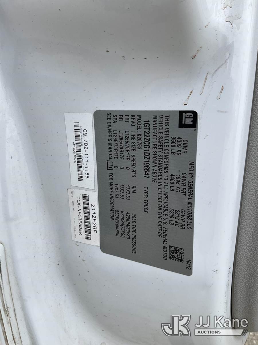 2013 GMC Sierra 2500HD Extended-Cab Pickup Truck, s/n 1GT22ZCG1DZ196547, 6.0L V8 OHV 16V 4WD, FFV, 6-Speed Automatic, A/C, with Ladder rack, tow package, (197,975 miles) (Runs & Moves, Missing Rear Seats) This is a Titled Item NOTE: This unit is being sold AS IS/WHERE IS via Timed Auction and is located in Dixon, CA. Inspection & preview days for this unit are the 2 business days prior to the first day of items closing for this auction, item is located at 8668 Sparling Ln Dixon, CA 95620 and hours of operations are 8a-4p. For pre-sale questions, please contact JJ Kane Staff at (707) 678-8060 (dixon@jjkane.com). Dealer License Number 45696. (Buyer is responsible for removal. Assistance by consignor or JJ Kane Auctions is not assured.)