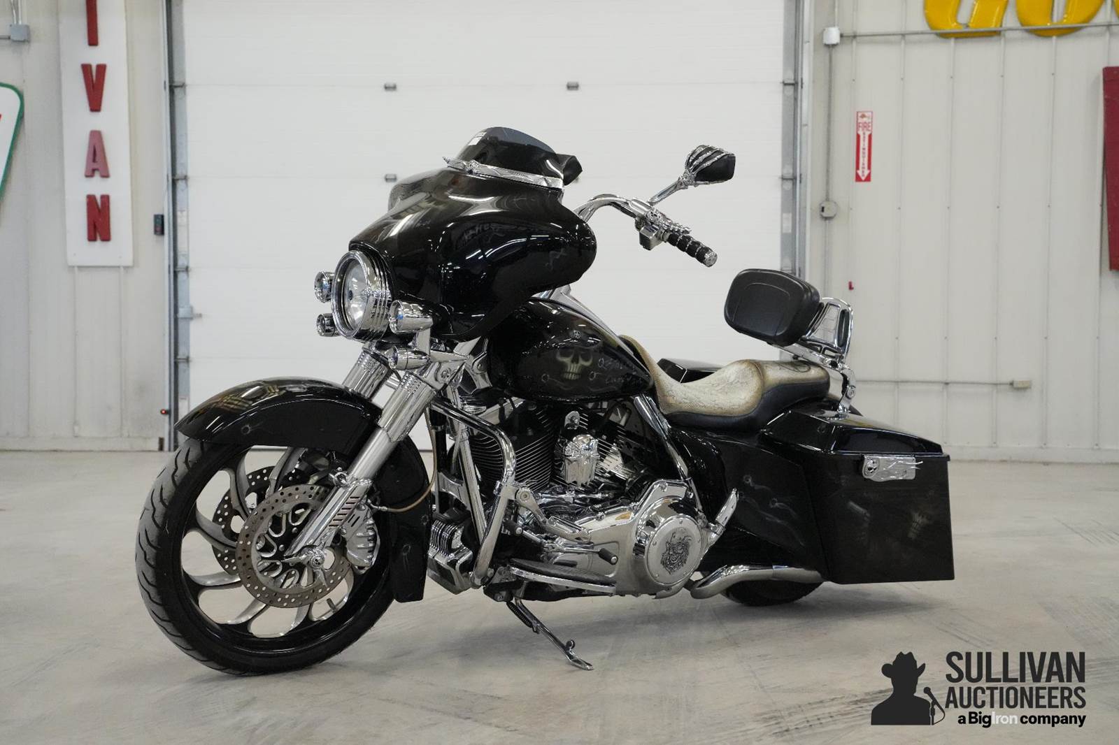 2013 Harley Davidson FLHX Motorcycle, 17,626 miles showing, 96 cubic inch motors, Six speed transmission, front and rear disc brakes, front faring with built in speakers, road tech zuma garmin, floor boards, riding pegs, cruise control, short back rest, snake skin seat, black paint with hand painted ghost accents, 21" polished aluminum single piece front wheel, Dunlop tire, 16" aluminum rear wheel Dunlop tire, purchased new, one owner, Key Number 1049, VIN: 1HD1KBM1XDB611501