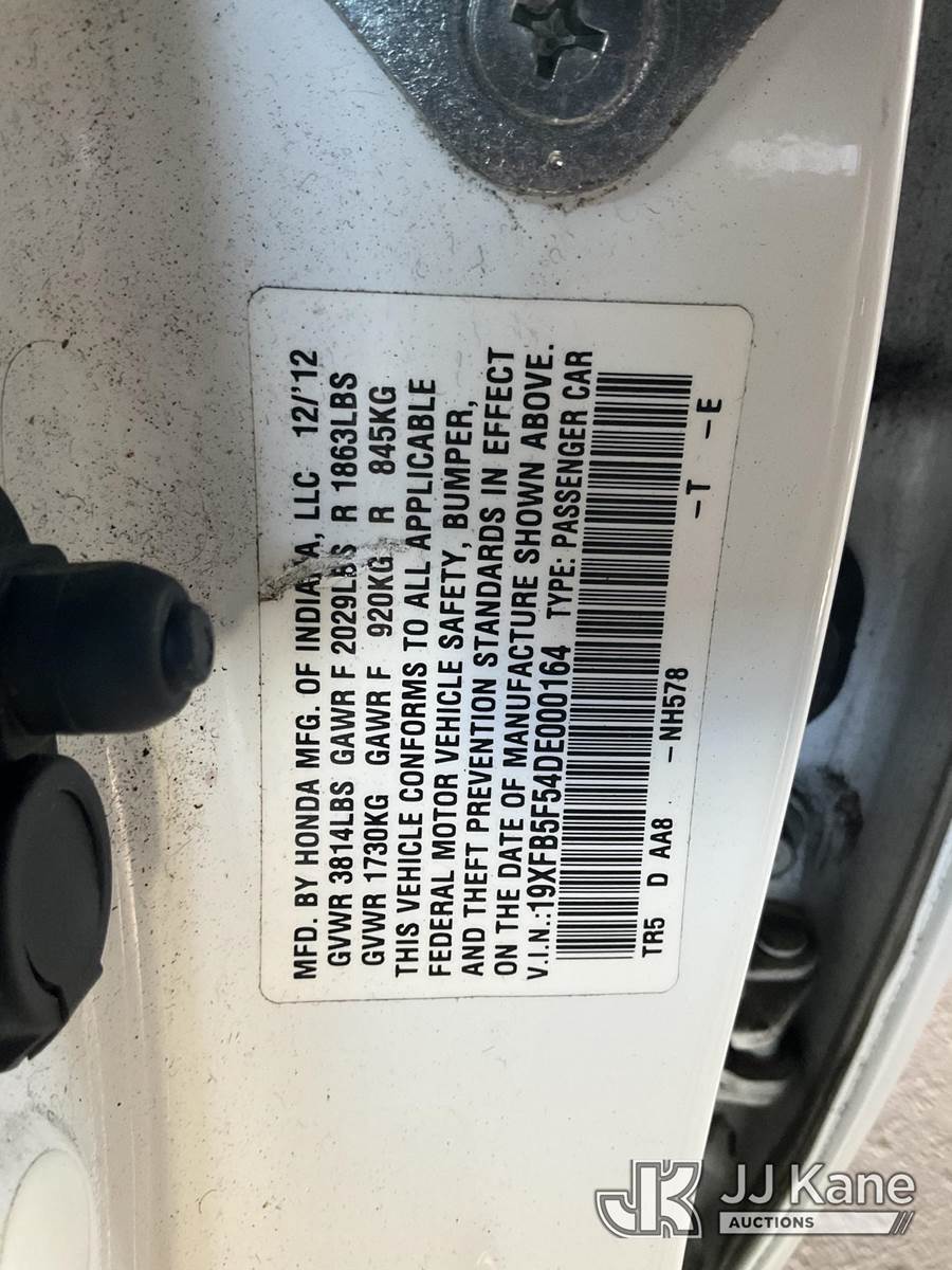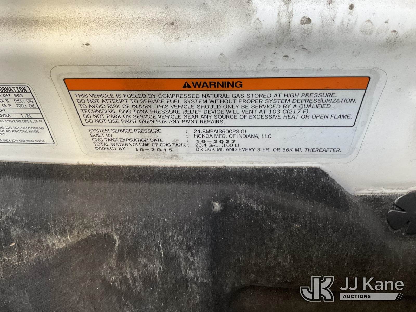 2013 Honda Civic 4-Door Sedan, 4-cyl, CNG, 5-Speed Automatic, A/C, (19,814 miles) (Runs & Moves) (CNG Tanks Expire 10-2027) This is a Titled Item NOTE: This unit is being sold AS IS/WHERE IS via Timed Auction and is located in Jurupa Valley, CA. Inspection & preview days for this unit are the 2 business days prior to the first day of items closing for this auction, item is located at 4510 Muth Way Jurupa Valley, CA 92509 and hours of operations are 8a-4p. For pre-sale questions, please contact please contact Office Staff @ (310) 353-7140. Dealer License Number 45696. (Buyer is responsible for removal. Assistance by consignor or JJ Kane Auctions is not assured.)
