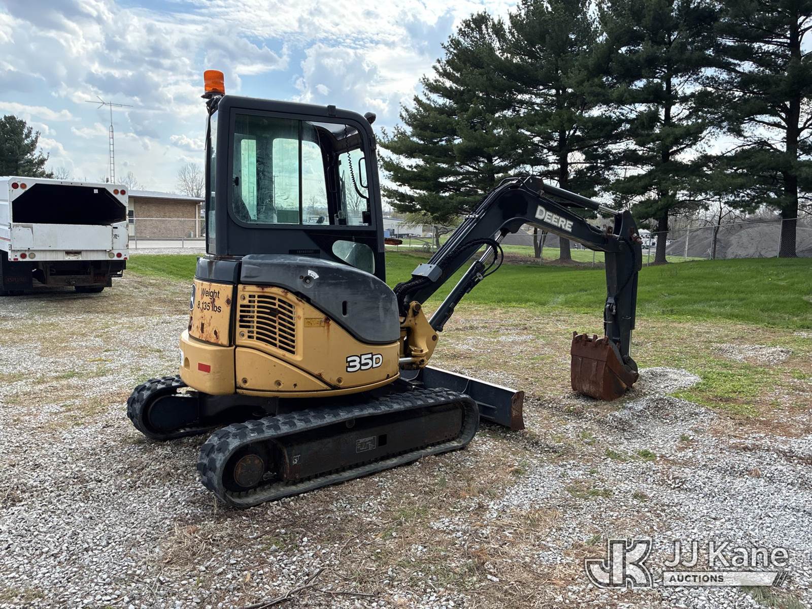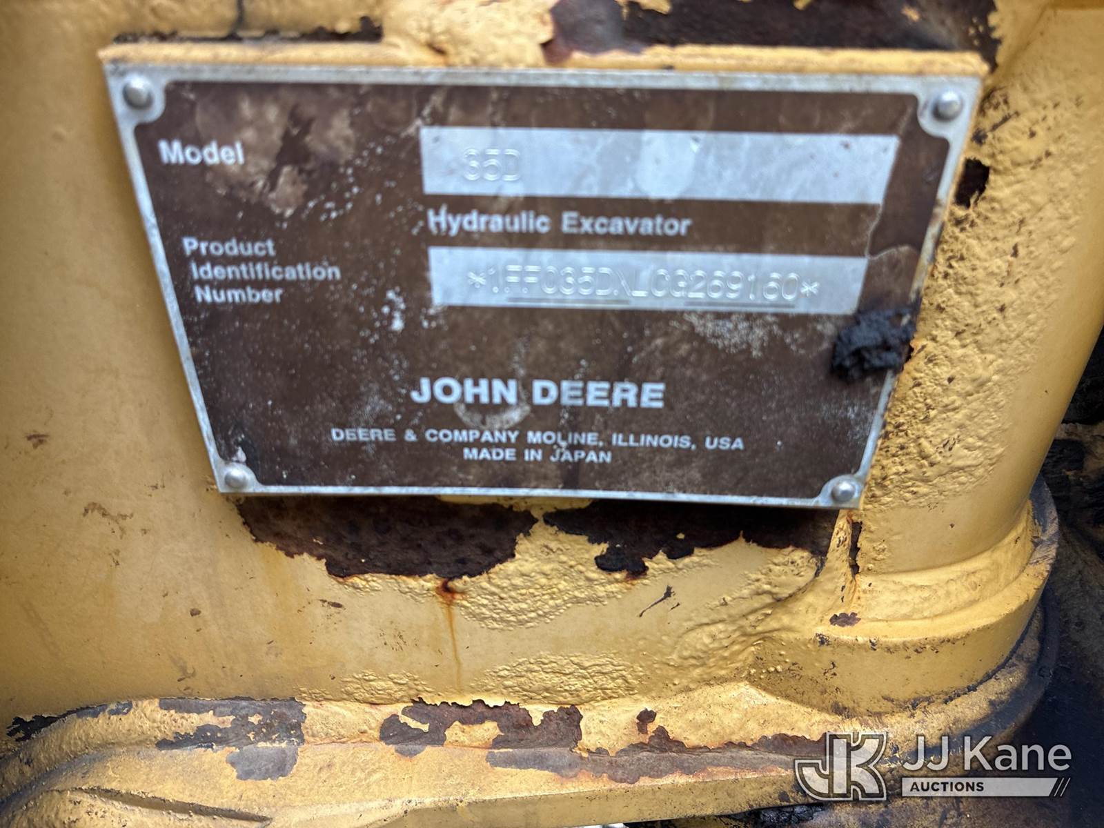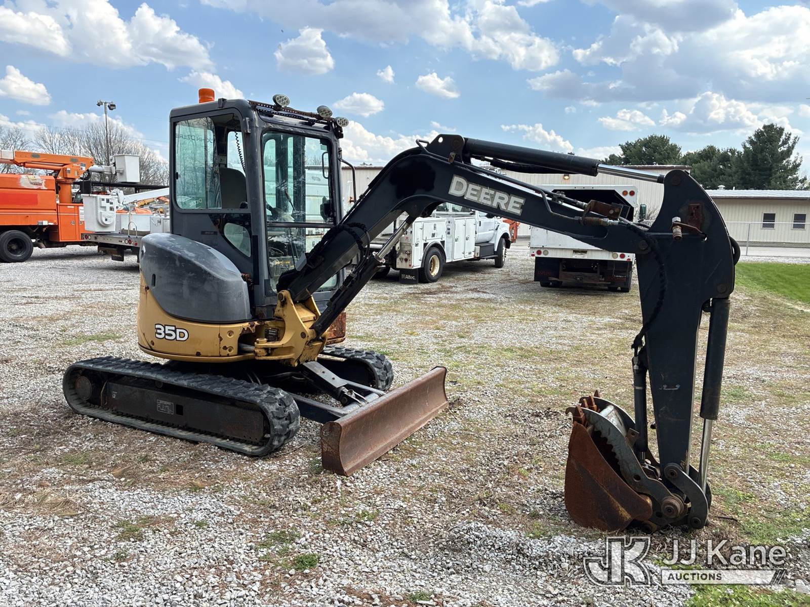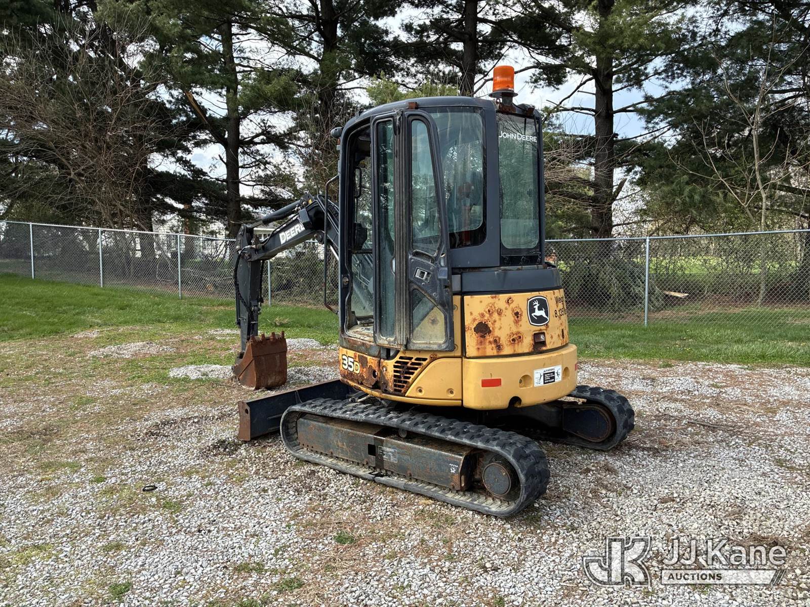 2013 John Deere 35D Mini Hydraulic Excavator, s/n 1FF035DXLCG269160, Yanmar diesel, Hydraulic Driven, with rubber tracks, hydraulic backfill blade, hydraulic thumb, 3rd valve & EROPS, Dead battery (Runs, Does Not Move Or Operate) (Rust Damage) (Reads 3,919 hours) NOTE: This unit is being sold AS IS/WHERE IS via Timed Auction and is located in Ashland, OH. Inspection & preview days for this unit are the 2 business days prior to the first day of items closing for this auction, item is located at 1463 Simonton Rd, Unit A, Ashland OH 44805 and hours of operations are 8a-4p. For pre-sale questions, please contact Jimmy Sanders @ (567) 474-5162 or jimmy.sanders@jjkane.com. (Buyer is responsible for removal. Assistance by consignor or JJ Kane Auctions is not assured.)