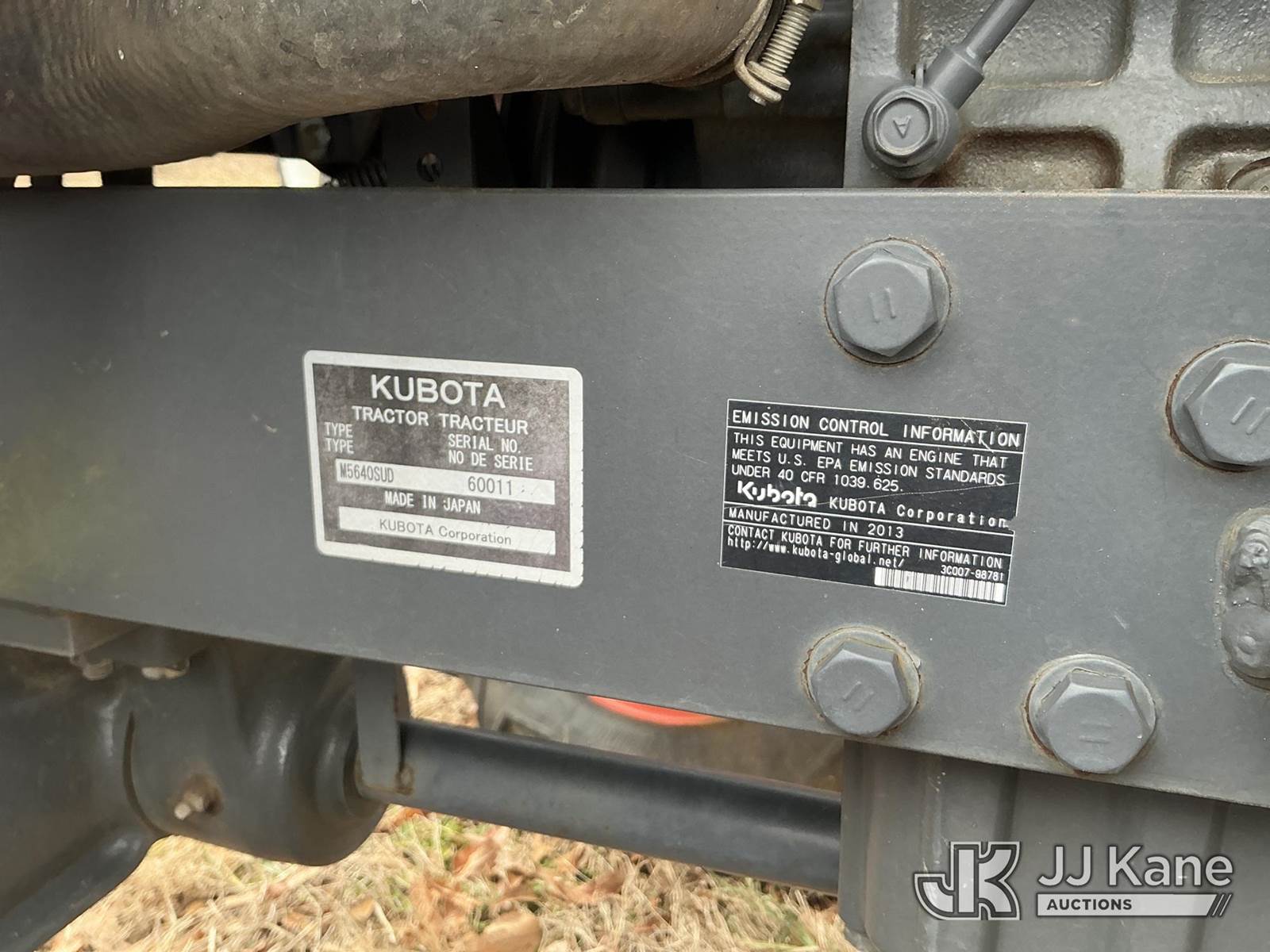 2013 Kubota M5640SU Utility Tractor, s/n 60011, Kubota diesel, 4-spd, with PTO, 3-point hitch, front counter weight & ROPS w/canopy, (Runs, Moves) (Reads 349 hours) NOTE: This unit is being sold AS IS/WHERE IS via Timed Auction and is located in Enoree, SC. For more information & removal arrangements please contact Pete Klimek @ 843-323-6538. (Buyer is responsible for removal. Assistance by consignor or JJ Kane Auctions is not assured.)