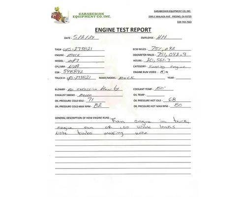 MP7, 405 HP, S/N 548842, 751,042.9 ECM Miles. Running engine. No excessive smoke or blowby. Turbo making noise & starting to whistle. (see video of engine running and test report). Sold outright and AS IS