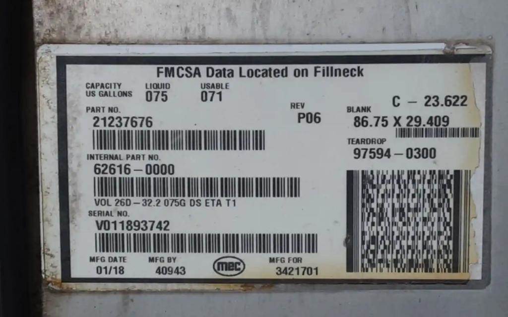 Driver Side LH Fuel Tank, 30"L x 26"W x 26"H, "D" Shape, 75 gal, Rear Fill, w/ Steps & Brackets. Small Scrape On Endcap. P/N 21237676.