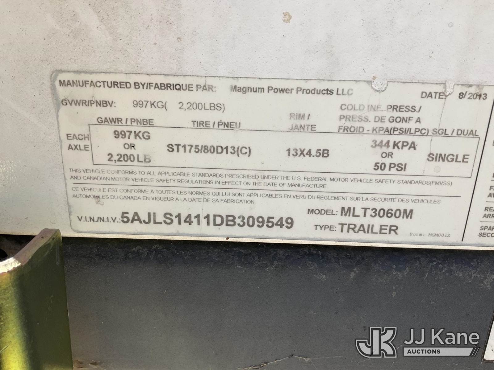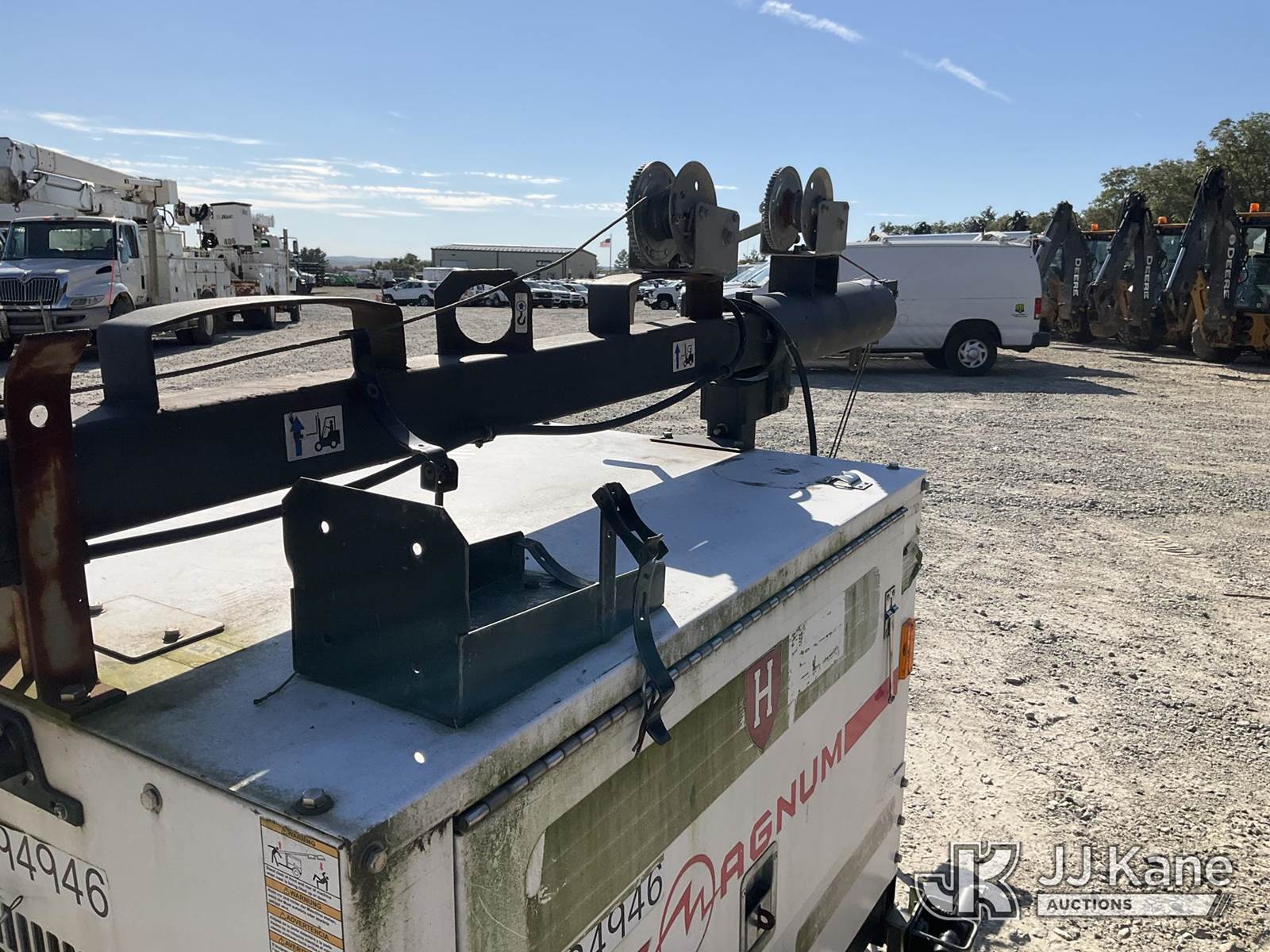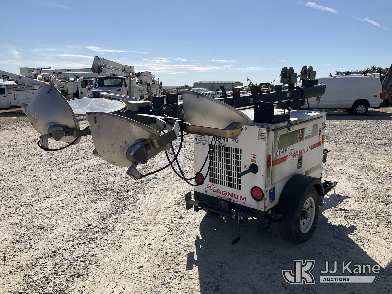 2013 Magnum Products MTL3060M Portable Light Tower, s/n 5AJLS1411DB309549, Mitsubishi diesel, trailer mtd (No Title) (Condition Unknown, No Crank) (Reads 9,717 hours) NOTE: This unit is being sold AS IS/WHERE IS via Timed Auction and is located in Shrewsbury, MA. Inspection & preview days for this unit are the 2 business days prior to the first day of items closing for this auction, item is located at 11 Fortune Blvd Shrewsbury, MA 01545 and hours of operations are 8a-4p. For pre-sale questions, please contact Rob Gifford @ (508) 864-4126. (Buyer is responsible for removal. Assistance by consignor or JJ Kane Auctioneers is not assured.)