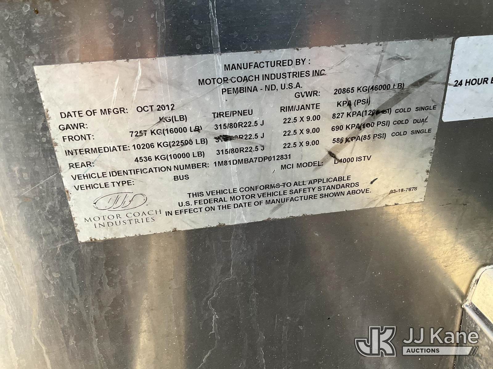 2013 MCI Transit Bus Passenger Bus, s/n 1M81DMBA7DP012831, Auto, True Mileage Unknown (Not Running, Condition Unknown) (No Key, Rear Sections Locked) (Bidding Restricted to Licensed Vehicle Dealers Only), Subject to CARB Regs,CARB non Compliant,Cannot Operate on CA Roads/Highways until Compliant This is a Titled Item NOTE: This unit is being sold AS IS/WHERE IS via Timed Auction and is located in Jurupa Valley, CA. Inspection & preview days for this unit are the 2 business days prior to the first day of items closing for this auction, item is located at 4510 Muth Way Jurupa Valley, CA 92509 and hours of operations are 8a-4p. For pre-sale questions, please contact please contact Office Staff @ (310) 353-7140. Dealer License Number 45696. (Buyer is responsible for removal. Assistance by consignor or JJ Kane Auctions is not assured.)