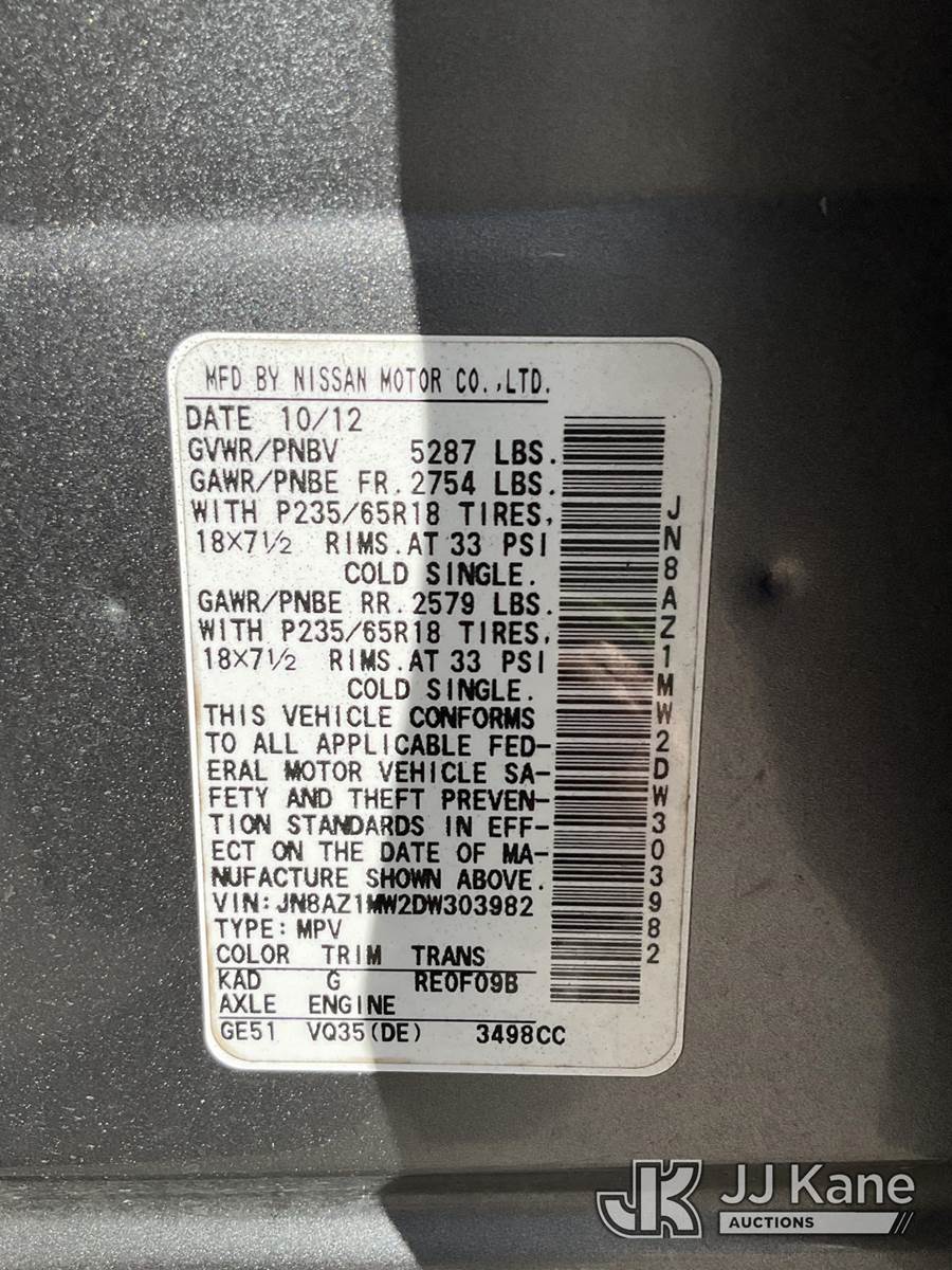 2013 Nissan Murano 4-Door Sport Utility Vehicle, 3.5L V6 DOHC 24V Auto, 4WD, Gas, A/C, (138,938 miles) (Runs & Moves) (Check Engine Light On) This is a Titled Item NOTE: This unit is being sold AS IS/WHERE IS via Timed Auction and is located in South Beloit, IL. Inspection & preview days for this unit are the 2 business days prior to the first day of items closing for this auction, item is located at 14354 Dearborn Ave South Beloit, IL and hours of operations are 8a-4p. For pre-sale questions, please contact Derek Eklund at (608) 904-0618 or (derek.eklund@jjkane.com). (Buyer is responsible for removal. Assistance by consignor or JJ Kane Auctioneers is not assured.)