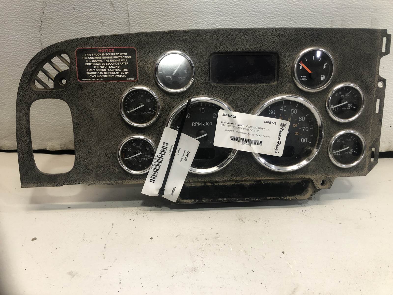 (USED) Peterbilt 365 Gauges: 8 Engine: CUMMINS ISL Part#: Q43-6046-100001 COOLANT TEMP, OIL PSI, VOLTS, TACH, SPEEDO, FUEL, PRIMARY AIR PSI, SECONDARY AIR PSI