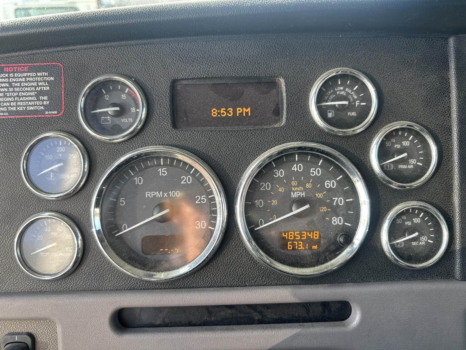 ISX12 Cummins Turbo Diesel Engine, 10 Speed Eaton Fuller Manual Transmission, Air Ride Suspension, PTO, Differential Lock, Air Sliding Fifth Wheel, Yanmar Powered ThermoKing TriPac APU, Power Invertor, Air Ride Drivers Seat, Heat/Ac, Am/Fm Radio, Cruise Control, Heated Mirrors, Power Windows, Power Locks, Power Mirrors, Sleeper Cab Controls, Full Aluminum Rims, 295/75R22.5 Tires