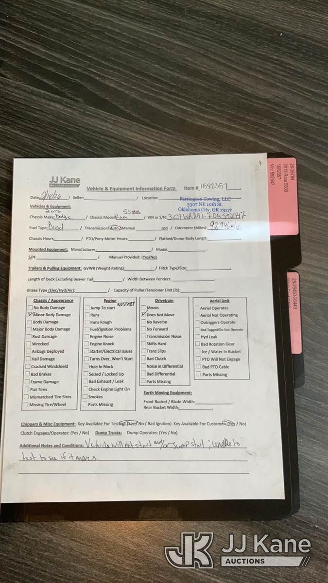 2013 RAM 5500 Crew Cab 4WD Crew-Cab Flatbed/Service Truck, 6.7L L6 OHV 24V TURBO DIESEL Auto, A/C, with front winch, (149,583 miles) (Not Running, Condition Unknown) This is a Titled Item NOTE: This unit is being sold AS IS/WHERE IS via Timed Auction and is located in Oklahoma City, OK. Inspection & preview days for this unit are by appointment only; please contact us at contact@jjkane.com or 84-Go-JJKane for more details. (Buyer is responsible for removal. Assistance by consignor or JJ Kane Auctions is not assured.)